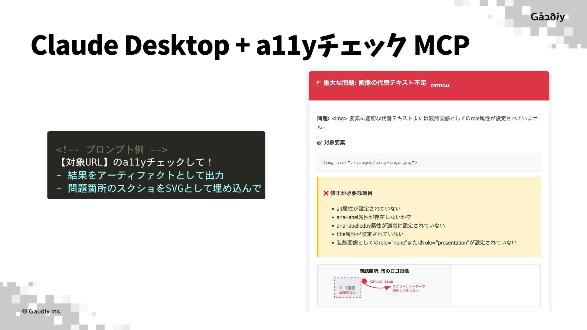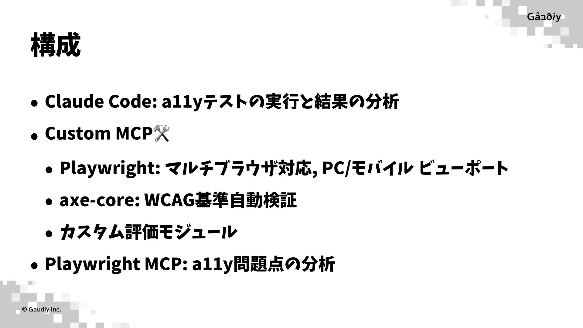 a11yチェック MCP • WCAGベースでチェックできるものは野良のツールのみ • 一応はチェック可能だが複数の課題あり (後述