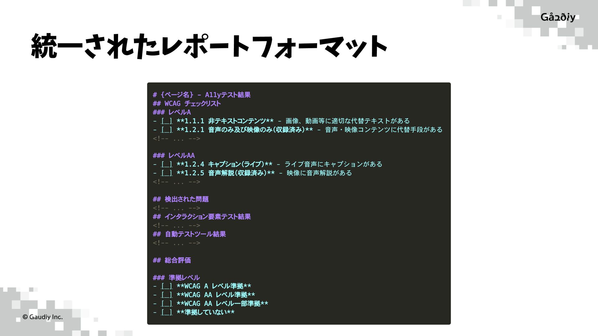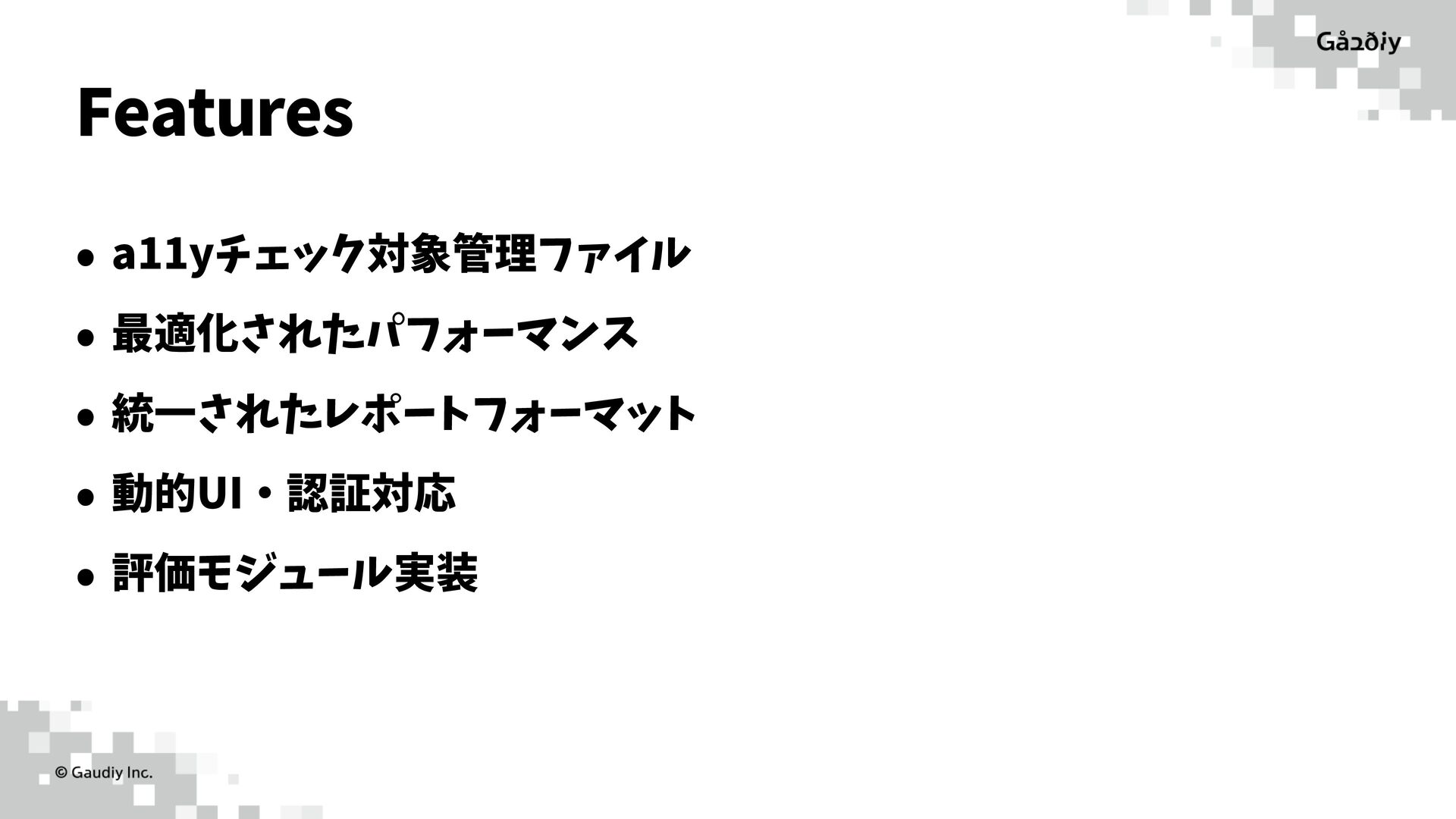 Features • a11yチェック対象管理ファイル • 最適化されたパフォーマンス • 統一されたレポートフォーマット • 動的UI・認証対応 •
