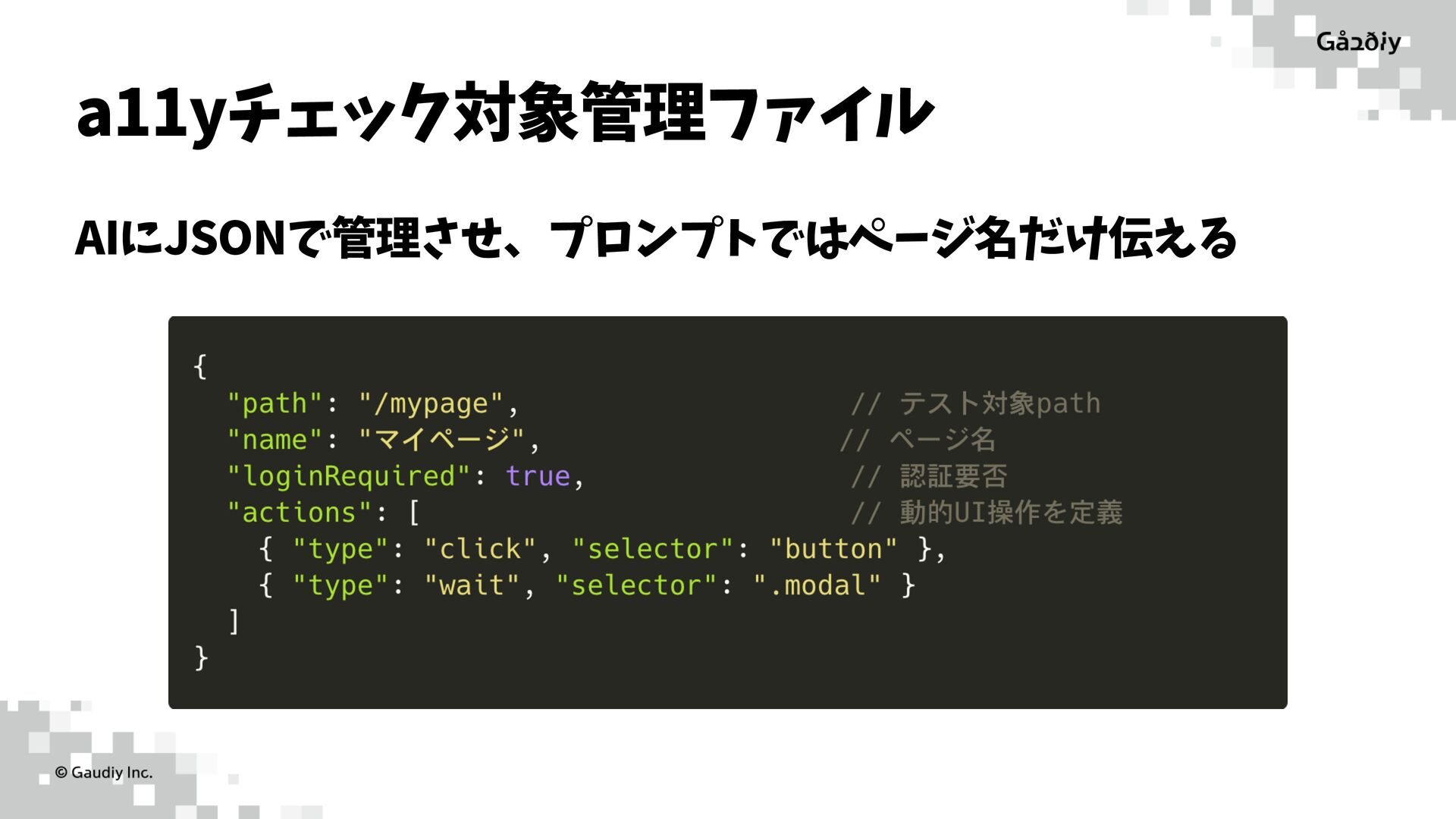 a11yチェック対象管理ファイル AIにJSONで管理させ、プロンプトではページ名だけ伝える