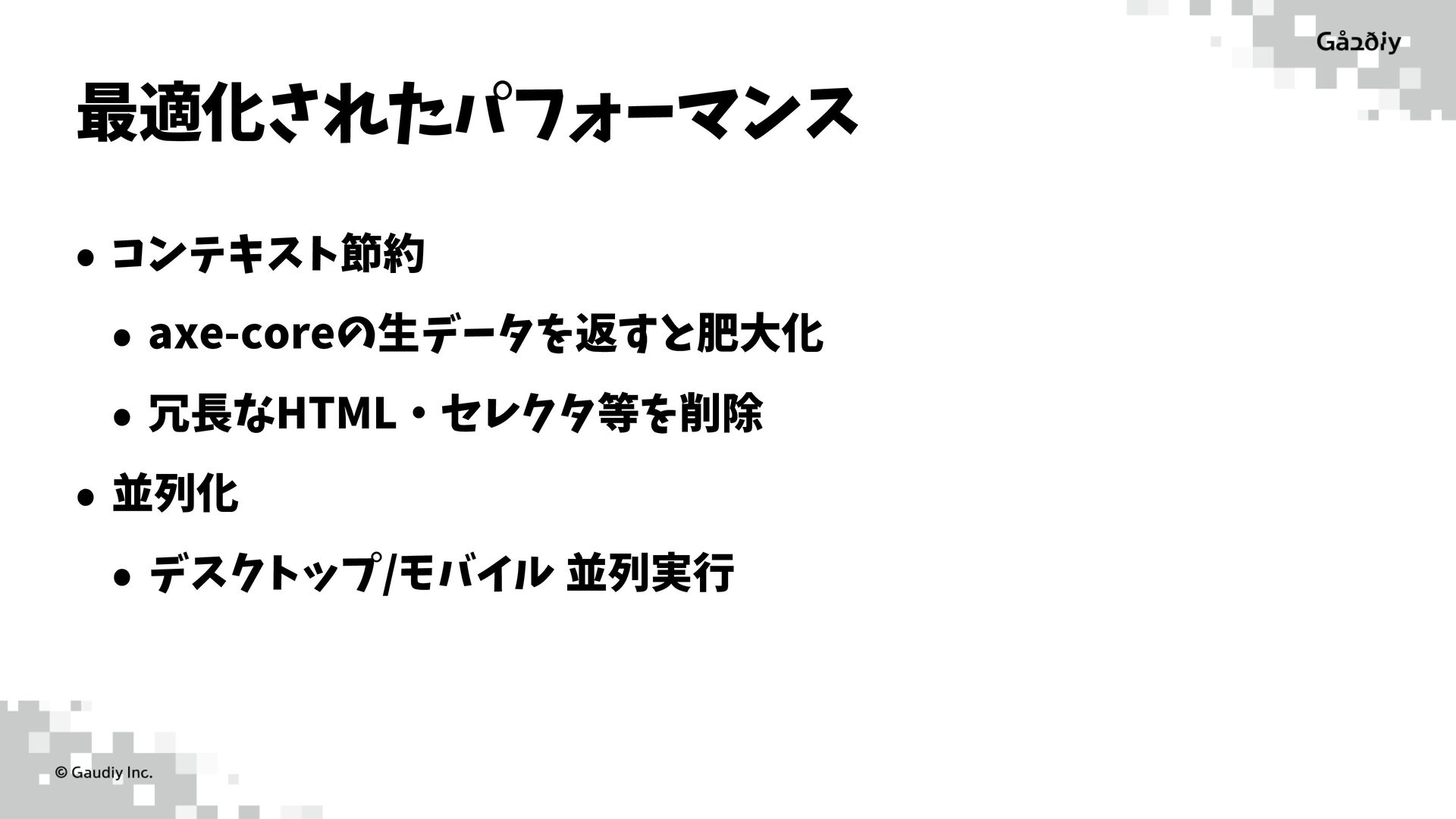 最適化されたパフォーマンス • コンテキスト節約 • axe-coreの生データを返すと肥大化 • 冗長なHTML・セレクタ等を削除 • 並列化 •
