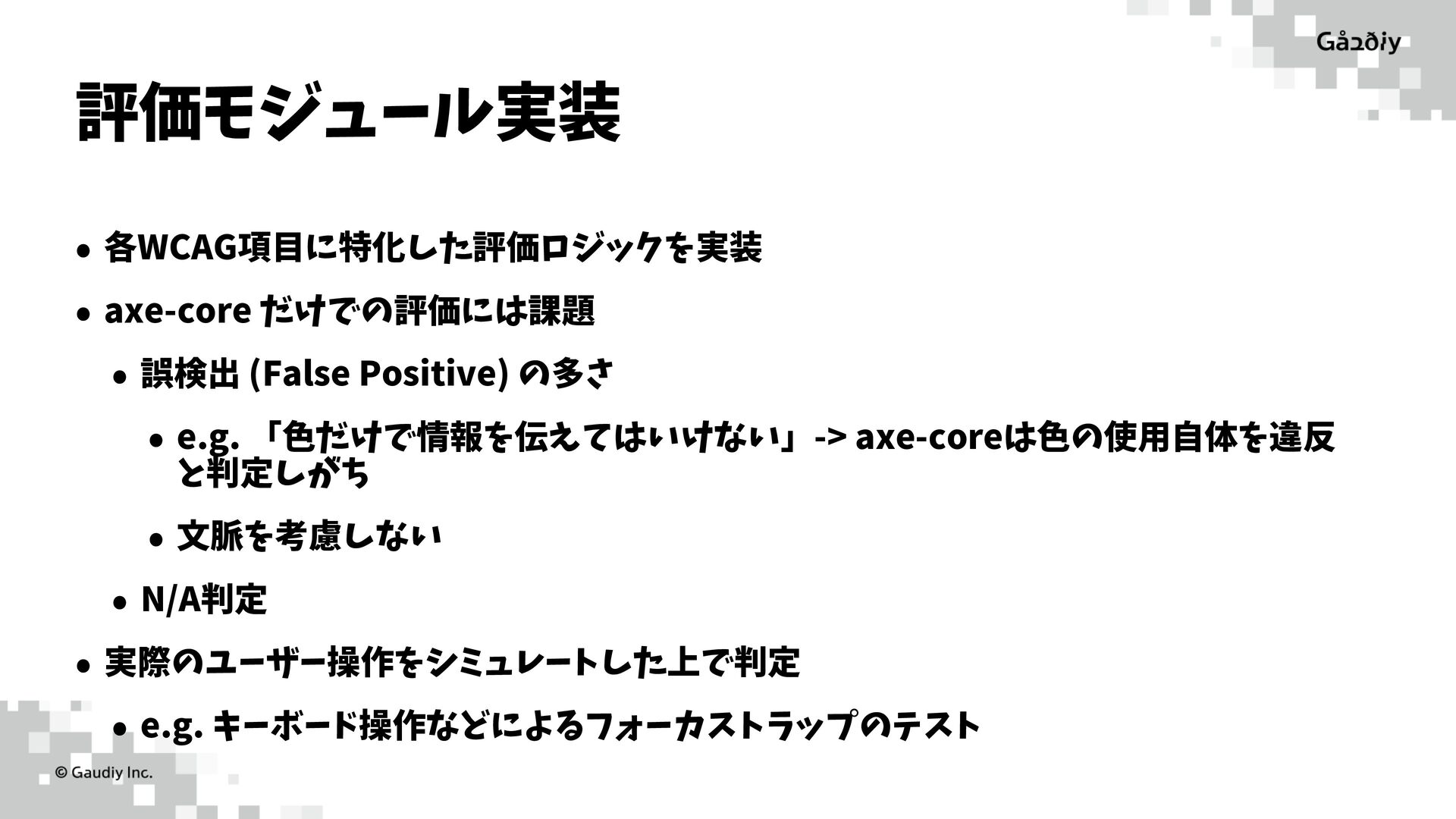 評価モジュール実装 • 各WCAG項目に特化した評価ロジックを実装 • axe-core だけでの評価には課題 • 誤検出 (False Positive)