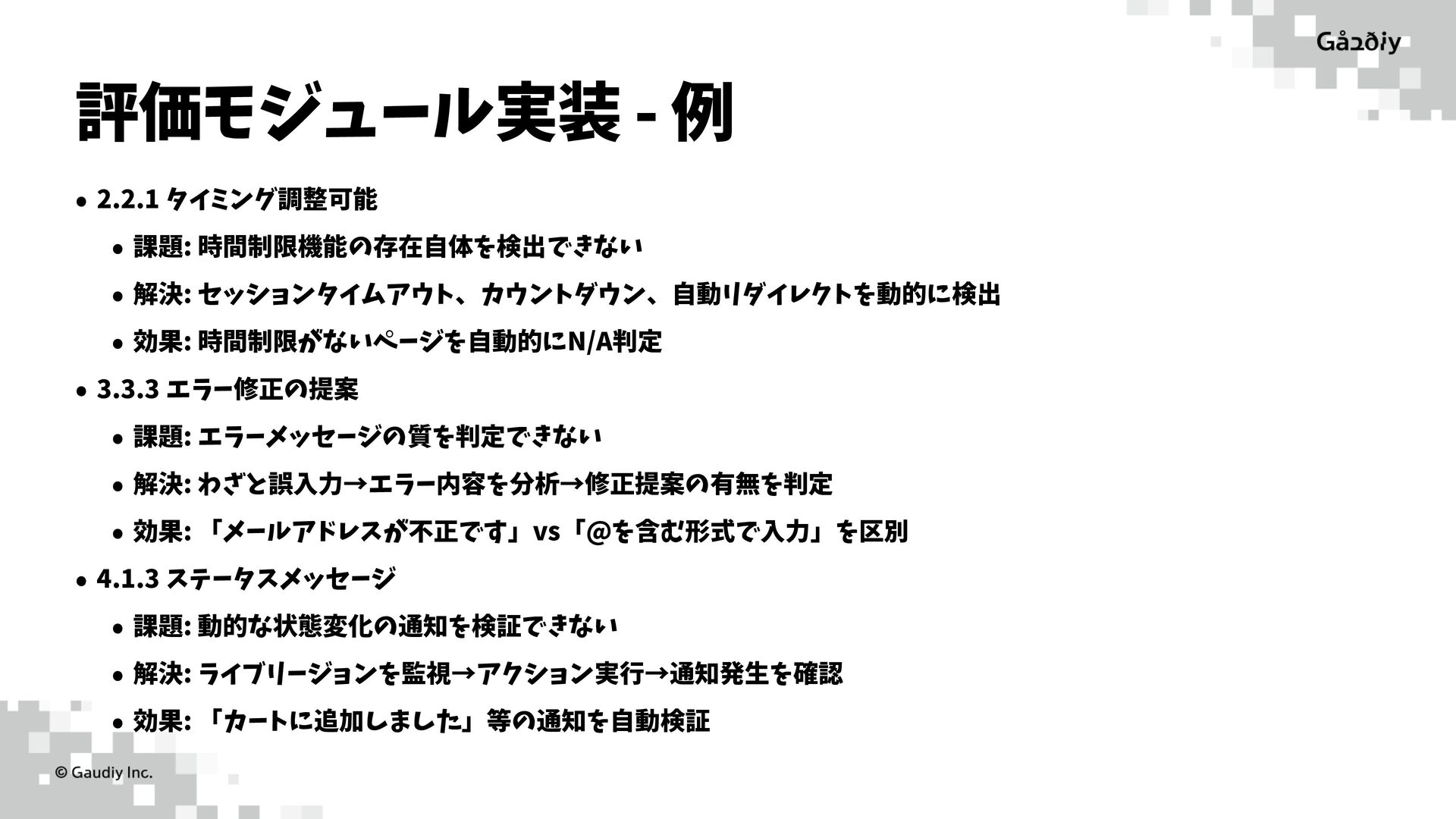 解決: セッションタイムアウト、カウントダウン、自動リダイレクトを動的に検出 • 効果: 時間制限がないページを自動的にN/A判定 • 3.3.3 エラー修正の提案 • 課題: エラーメッセージの質を判定できない • 解決: わざと誤入力→エラー内容を分析→修正提案の有無を判定 • 効果: 「メールアドレスが不正です」vs「@を含む形式で入力」を区別 • 4.1.3 ステータスメッセージ • 課題: 動的な状態変化の通知を検証できない • 解決: ライブリージョンを監視→アクション実行→通知発生を確認 • 効果: 「カートに追加しました」等の通知を自動検証