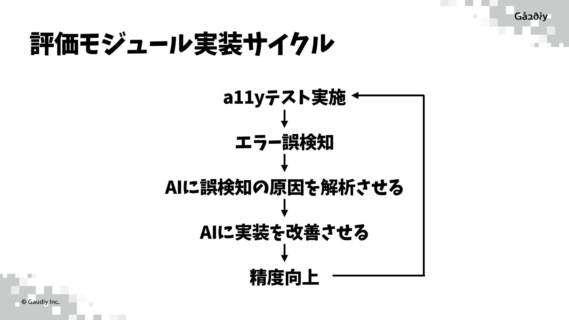 評価モジュール実装サイクル a11yテスト実施 AIに誤検知の原因を解析させる エラー誤検知 AIに実装を改善させる 精度向上