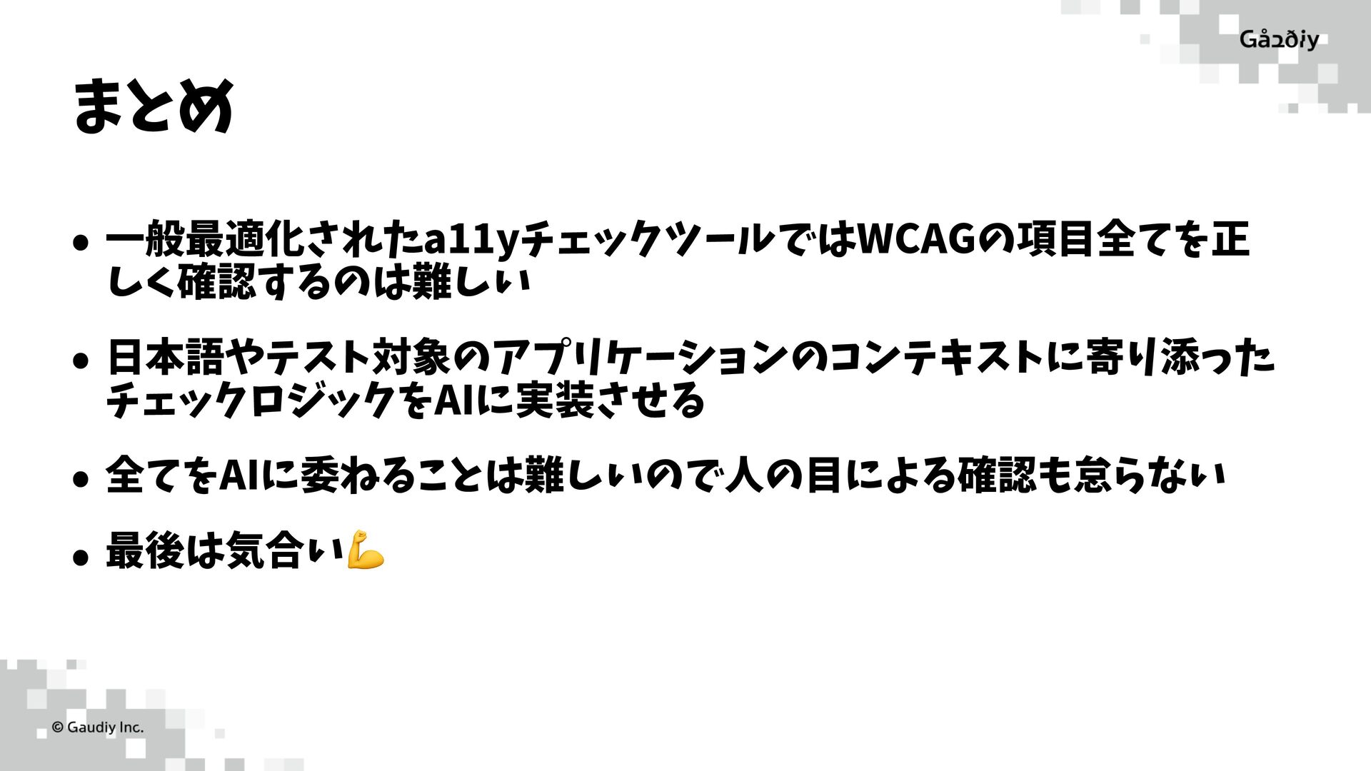 まとめ • 一般最適化されたa11yチェックツールではWCAGの項目全てを正 しく確認するのは難しい • 日本語やテスト対象のアプリケーションのコンテキストに寄り添った チェックロジックをAIに実装させる • 全てをAIに委ねることは難しいので人の目による確認も怠らない •