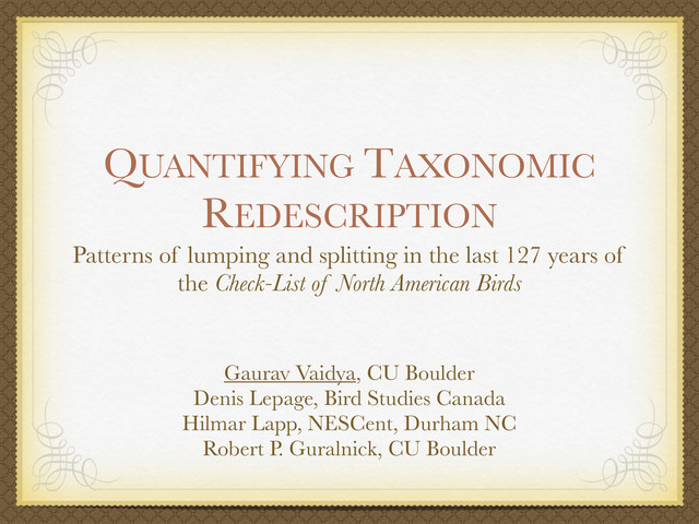 last 127 years of the Check-List of North American Birds Gaurav Vaidya, CU Boulder Denis Lepage, Bird Studies Canada Hilmar Lapp, NESCent, Durham NC Robert P. Guralnick, CU Boulder