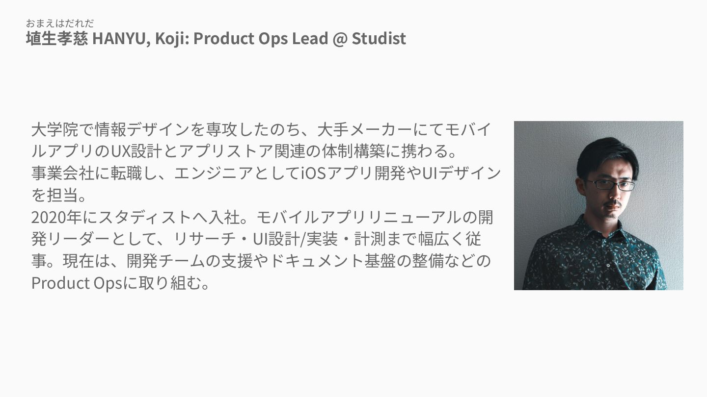 おまえはだれだ 埴⽣孝慈 HANYU, Koji: Product Ops Lead @ Studist ⼤学院で情報デザインを専攻したのち、⼤⼿メーカーにてモバイ