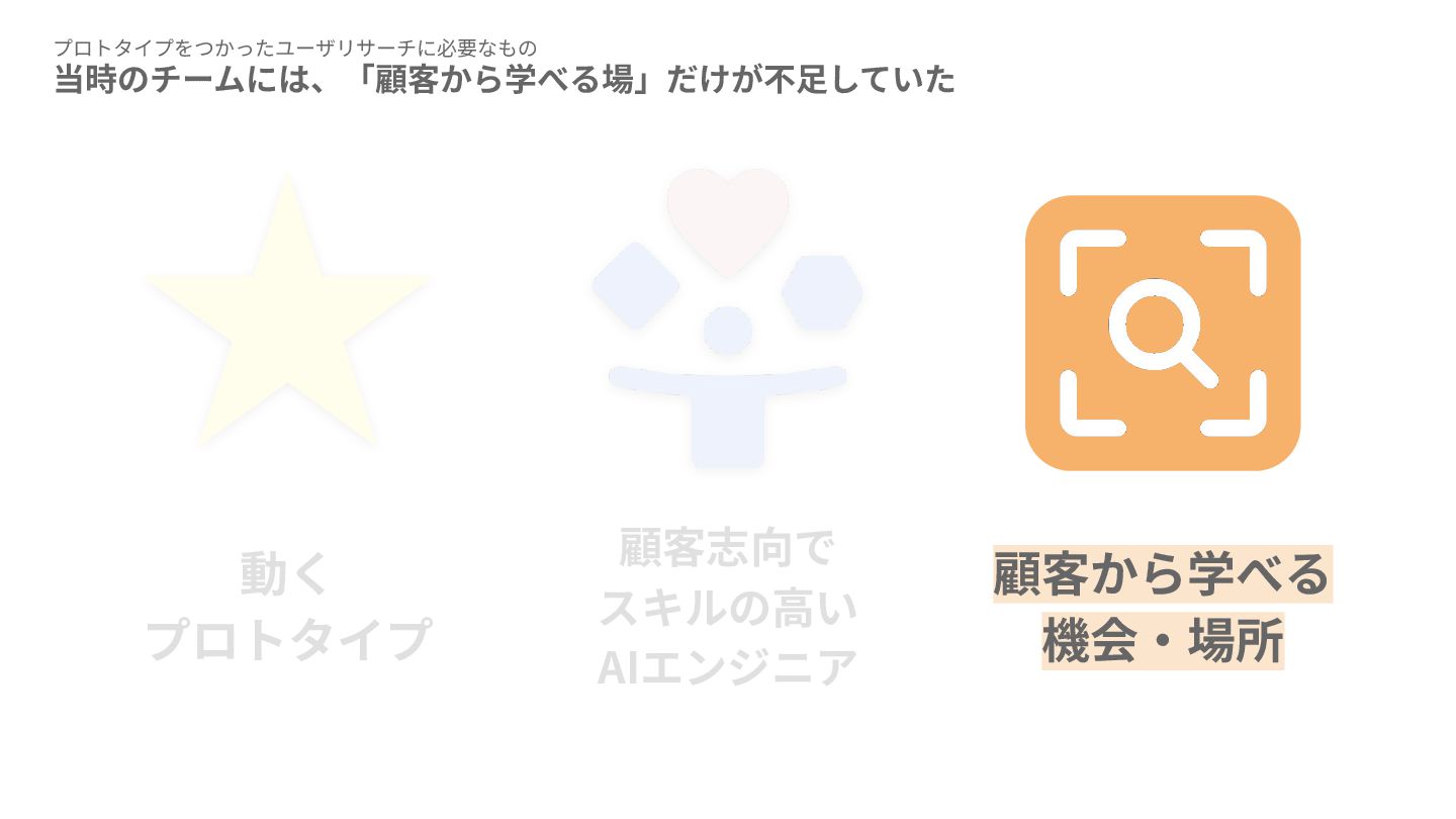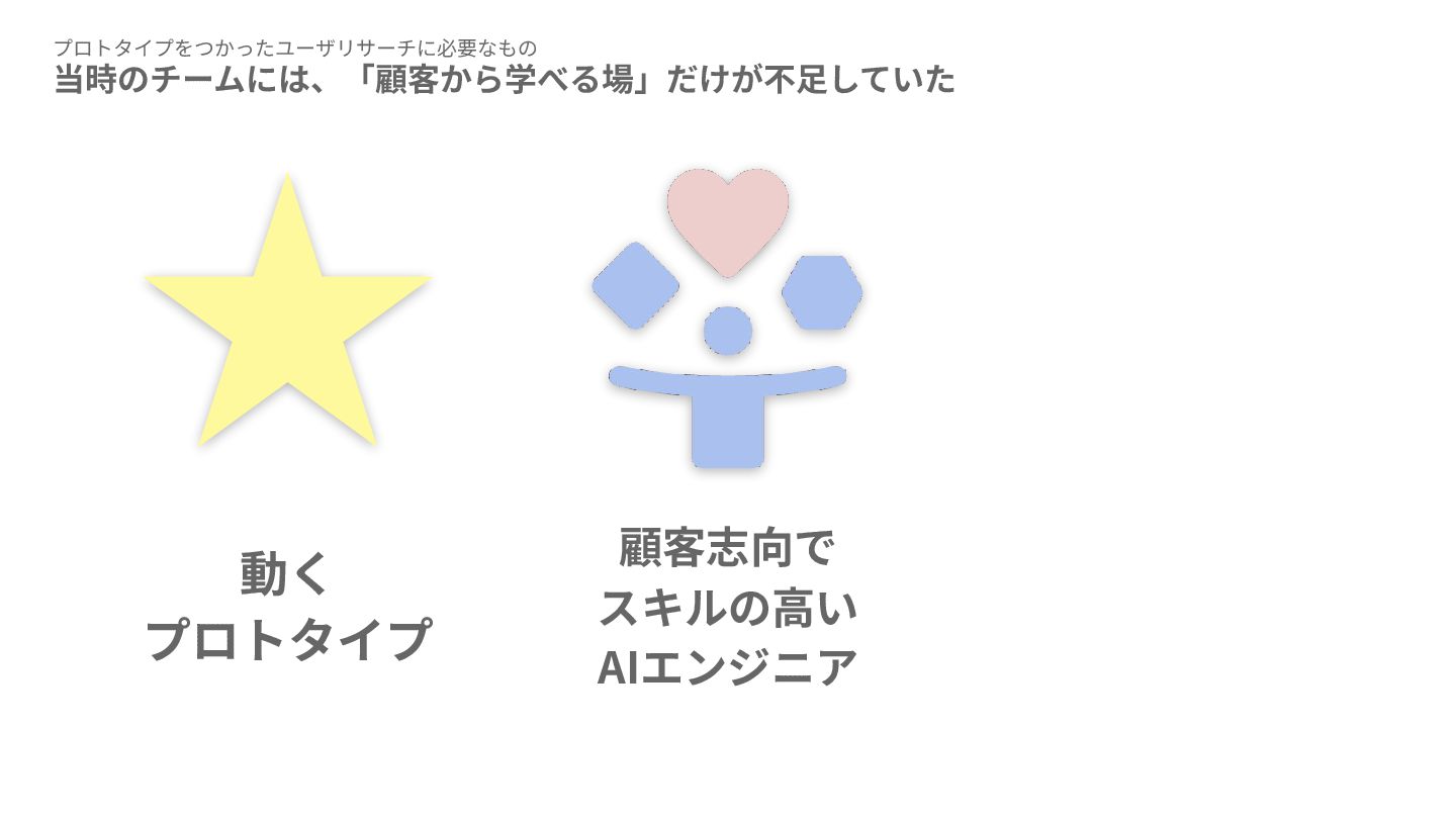 顧客志向で スキルの⾼い AIエンジニア プロトタイプをつかったユーザリサーチに必要なもの 当時のチームには、「顧客から学べる場」だけが不⾜していた 動く プロトタイプ 顧客から学べる 機会‧場所