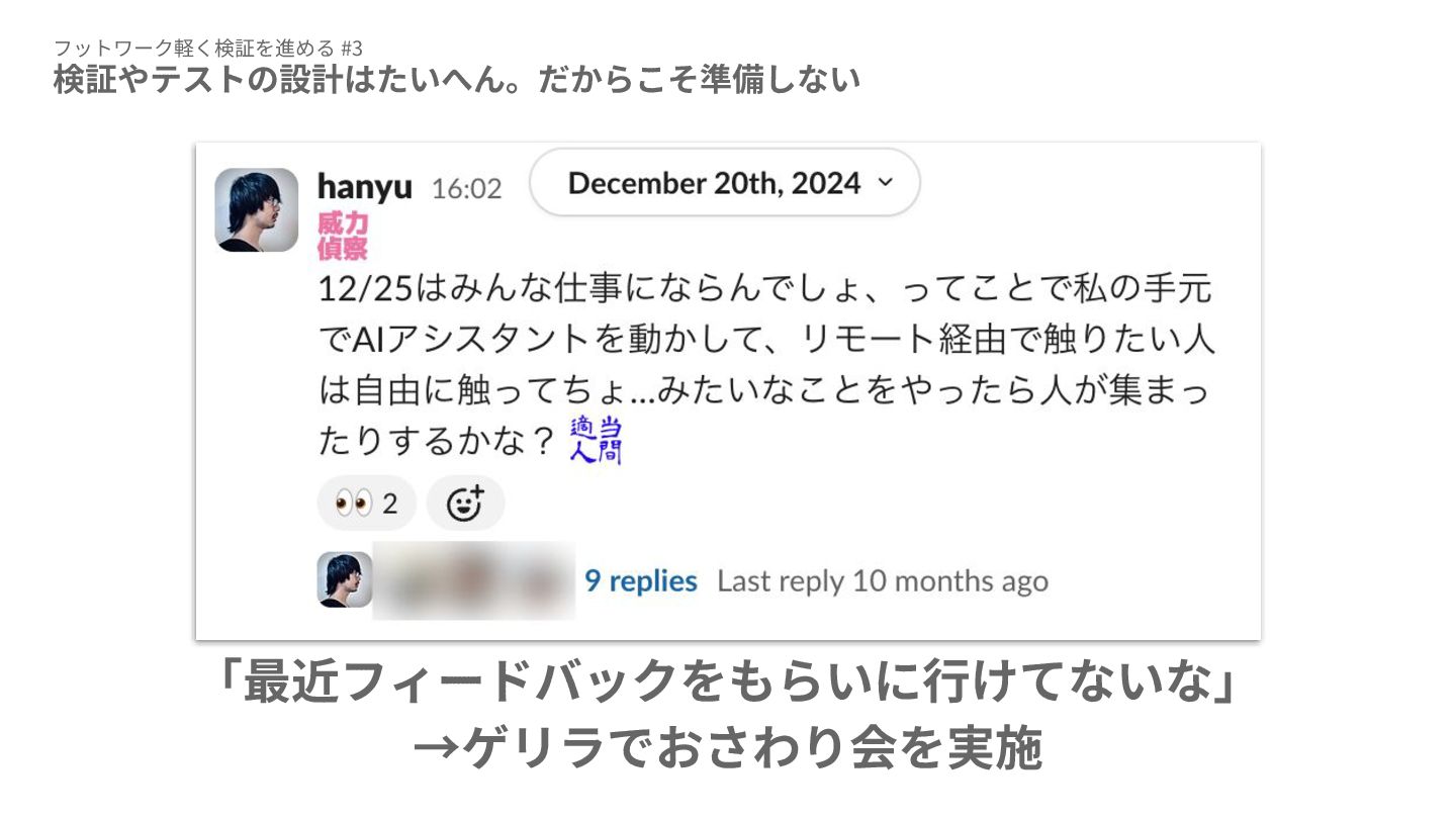 フットワーク軽く検証を進める #3 検証やテストの設計はたいへん。だからこそ準備しない 「最近フィードバックをもらいに⾏けてないな」 →ゲリラでおさわり会を実施