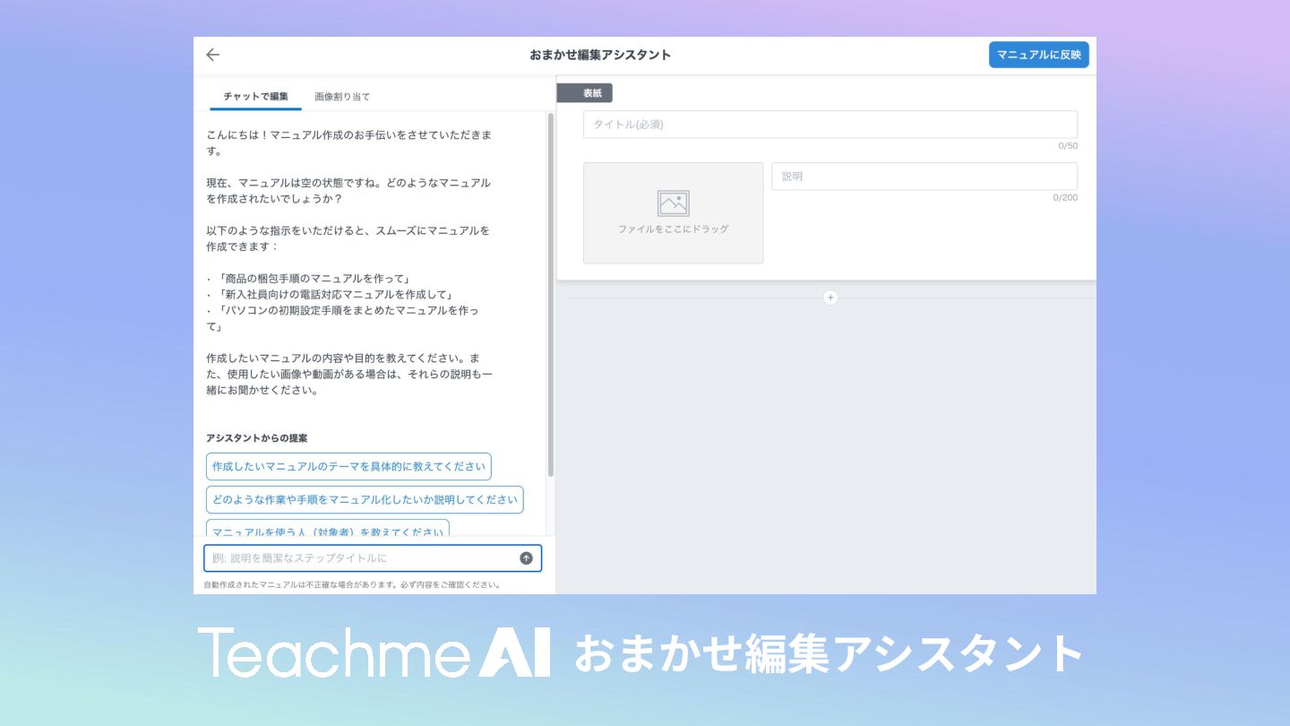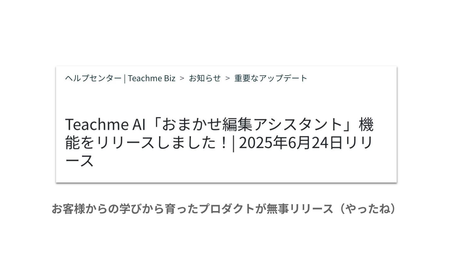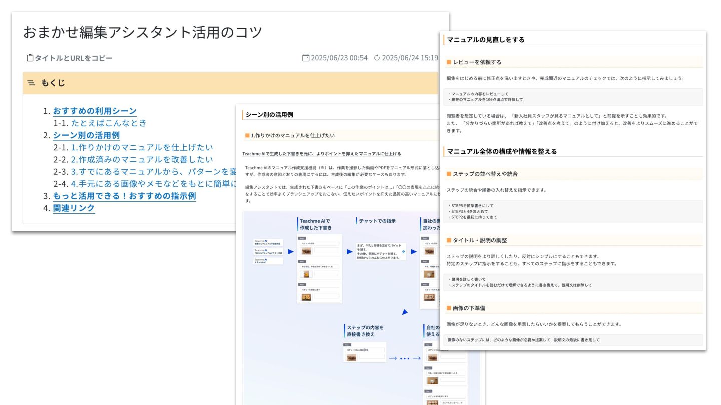 Teachme Biz おまかせ編集アシスタント: https://vimeo.com/1094928233/1a9b912d1d • おまかせ編集アシスタント活⽤のコツ - Teachme Biz ヘルプセンター: https://help.teachme.jp/hc/ja/articles/48192466935833 • おまかせ編集アシスタントで使える便利な指⽰の例 - Teachme Biz ヘルプセンター: https://help.teachme.jp/hc/ja/articles/48220414677017