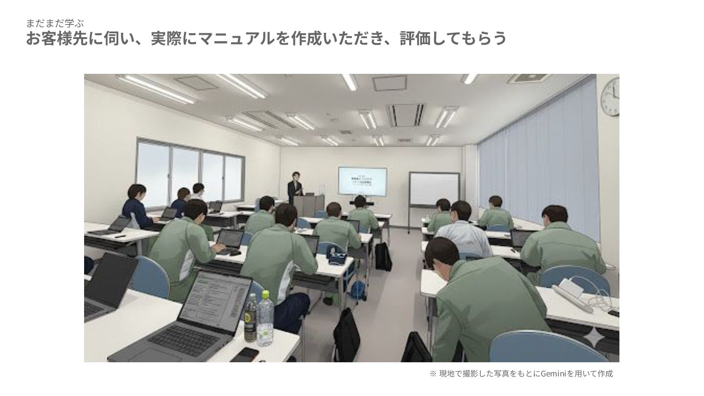 まだまだ学ぶ お客様先に伺い、実際にマニュアルを作成いただき、評価してもらう ※ 現地で撮影した写真をもとにGeminiを⽤いて作成
