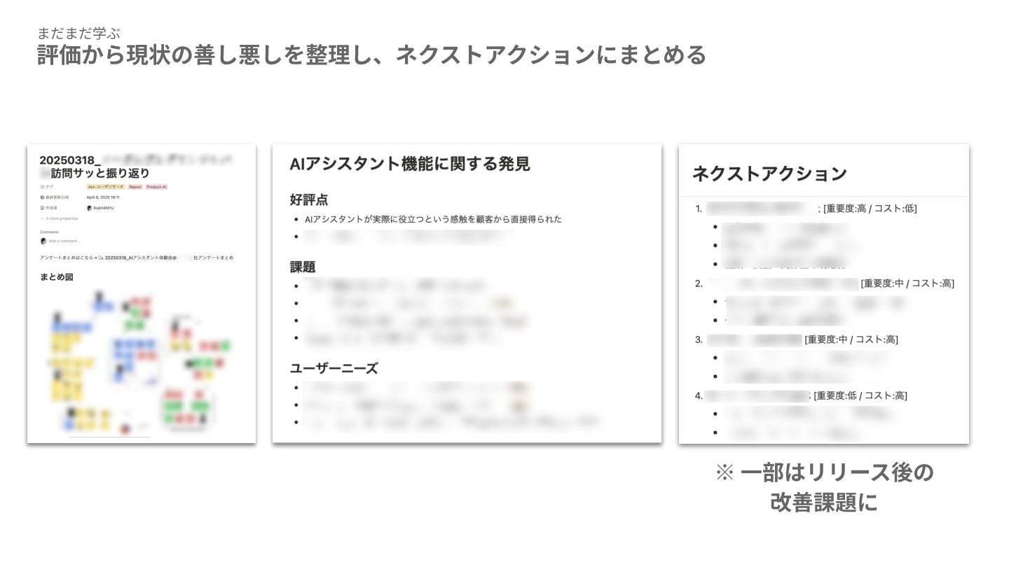 まだまだ学ぶ 評価から現状の善し悪しを整理し、ネクストアクションにまとめる ※ ⼀部はリリース後の 改善課題に