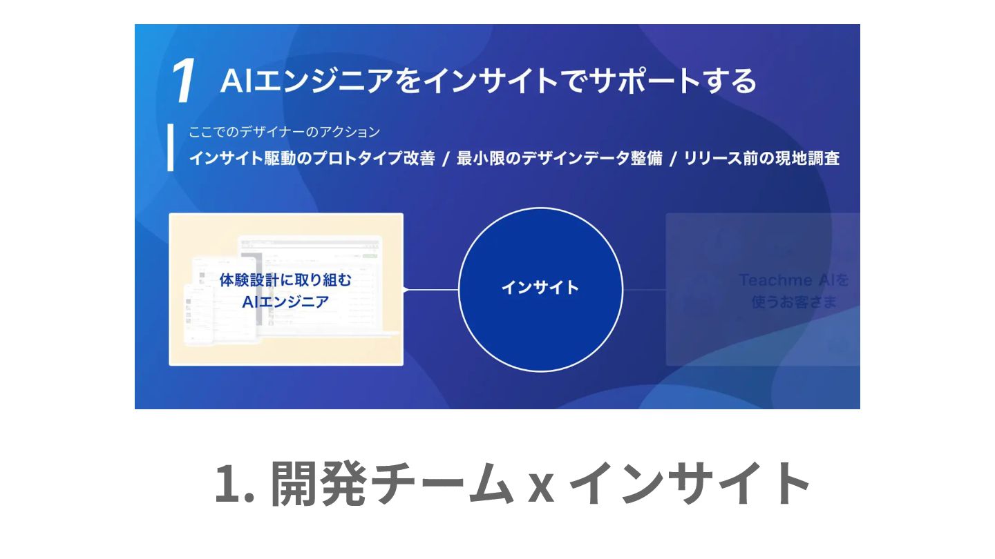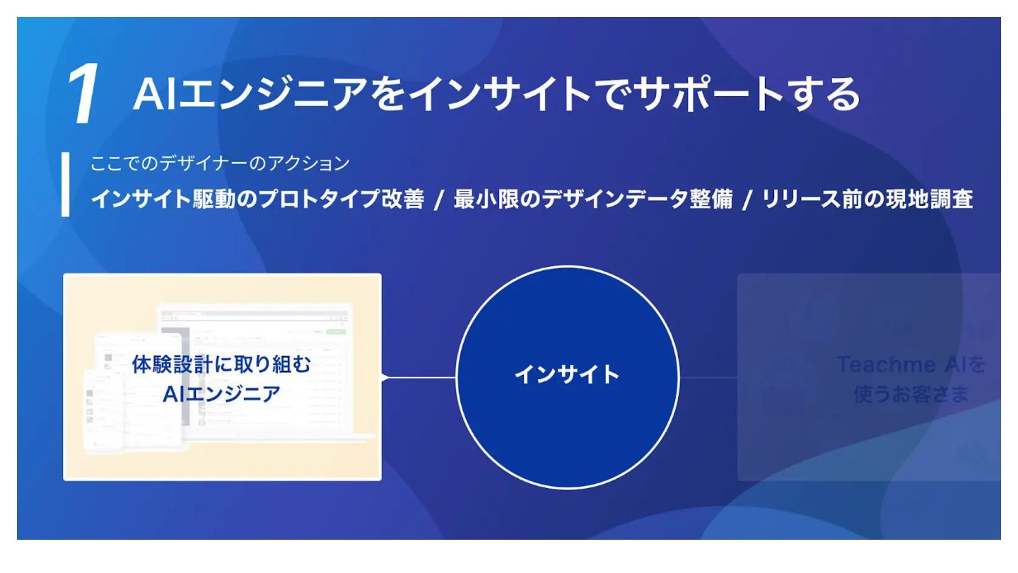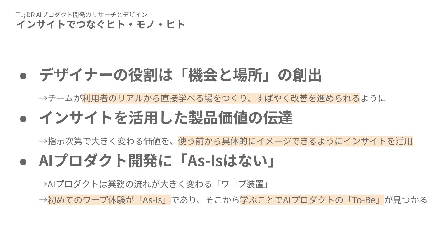 TL; DR AIプロダクト開発のリサーチとデザイン インサイトでつなぐヒト‧モノ‧ヒト • デザイナーの役割は「機会と場所」の創出 →チームが利⽤者のリアルから直接学べる場をつくり、すばやく改善を進められるように • インサイトを活⽤した製品価値の伝達 →指⽰次第で⼤きく変わる価値を、使う前から具体的にイメージできるようにインサイトを活⽤