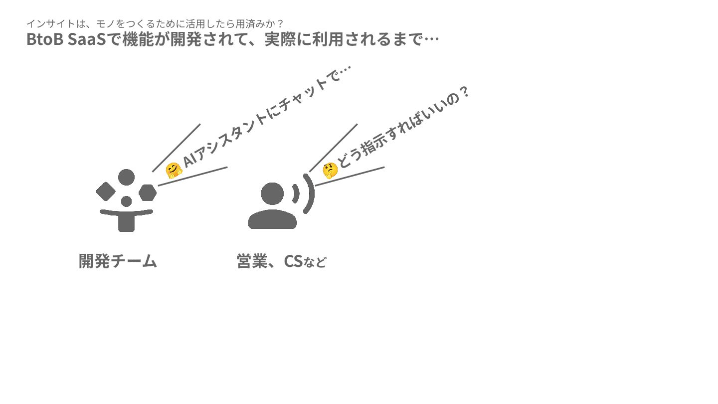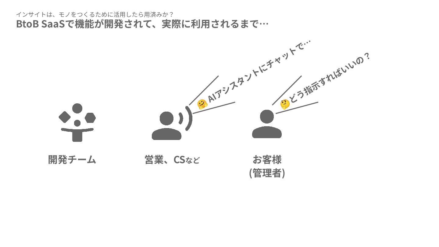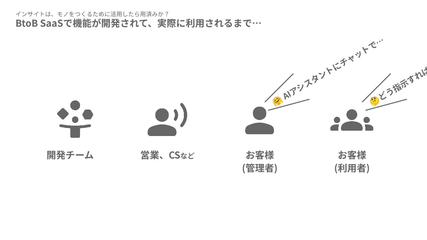 (管理者) お客様 (利⽤者) 🤗 AIアシ ス タ ン ト に チャ ッ ト で … インサイトは、モノをつくるために活⽤したら⽤済みか? BtoB SaaSで機能が開発されて、実際に利⽤されるまで…