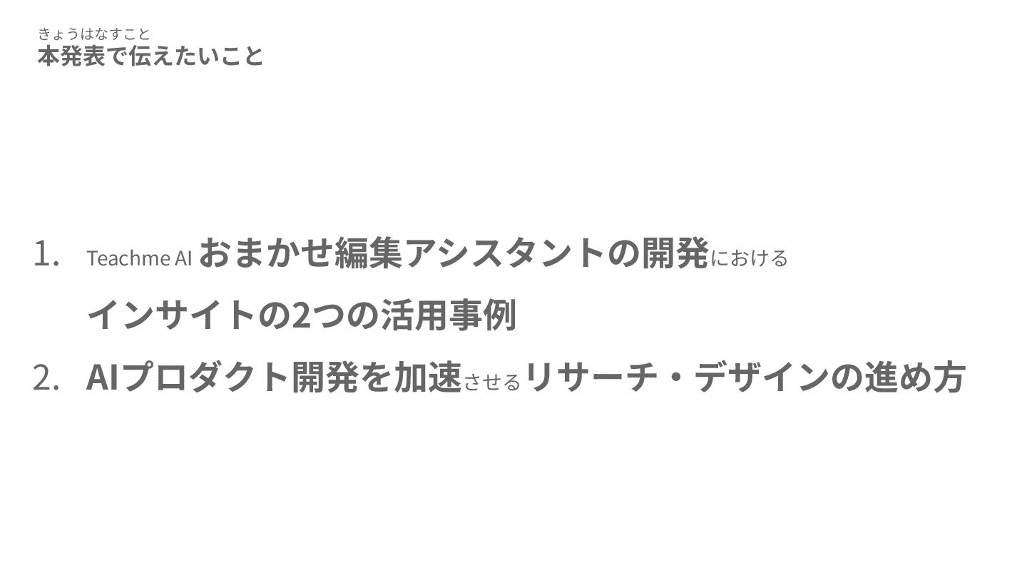 きょうはなすこと 本発表で伝えたいこと 1. Teachme AI おまかせ編集アシスタントの開発における インサイトの2つの活⽤事例 2. AIプロダクト開発を加速させる リサーチ‧デザインの進め⽅