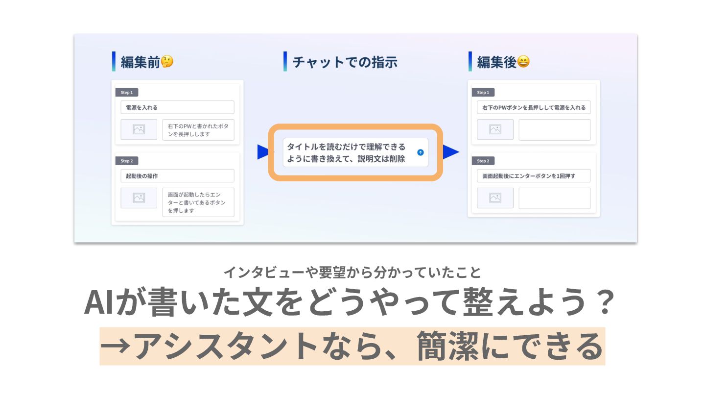 インタビューや要望から分かっていたこと AIが書いた⽂をどうやって整えよう? →アシスタントなら、簡潔にできる