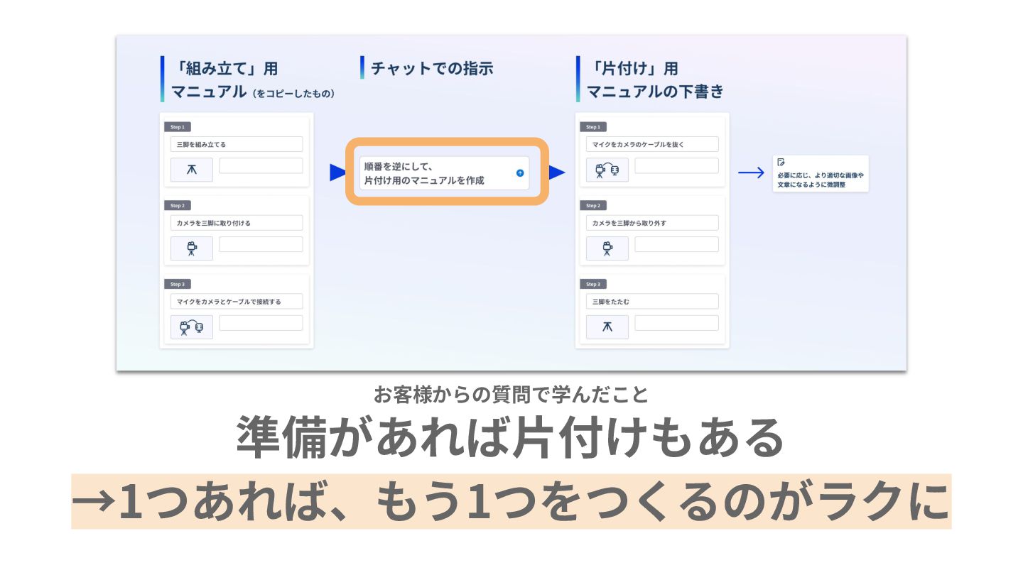 お客様からの質問で学んだこと 準備があれば⽚付けもある →1つあれば、もう1つをつくるのがラクに