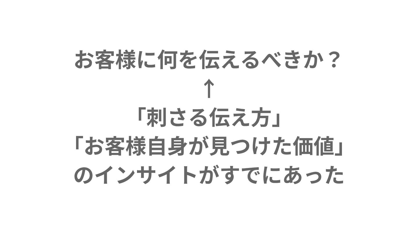 お客様に何を伝えるべきか? ↑ 「刺さる伝え⽅」 「お客様⾃⾝が⾒つけた価値」 のインサイトがすでにあった