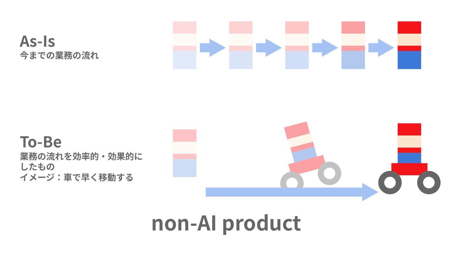non-AI product As-Is 今までの業務の流れ To-Be 業務の流れを効率的‧効果的に したもの イメージ:⾞で早く移動する