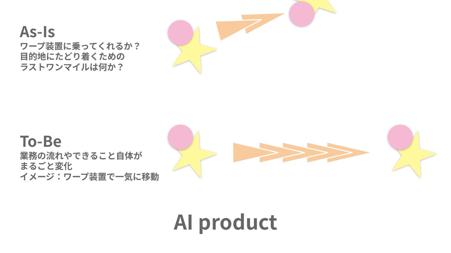 AI product As-Is ワープ装置に乗ってくれるか? ⽬的地にたどり着くための ラストワンマイルは何か? To-Be 業務の流れやできること⾃体が まるごと変化 イメージ:ワープ装置で⼀気に移動