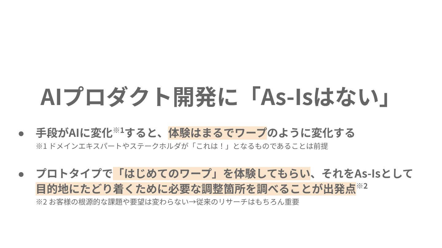 AIプロダクト開発に「As-Isはない」 • ⼿段がAIに変化※1すると、体験はまるでワープのように変化する ※1 ドメインエキスパートやステークホルダが「これは!」となるものであることは前提 • プロトタイプで「はじめてのワープ」を体験してもらい、それをAs-Isとして ⽬的地にたどり着くために必要な調整箇所を調べることが出発点※2 ※2 お客様の根源的な課題や要望は変わらない→従来のリサーチはもちろん重要