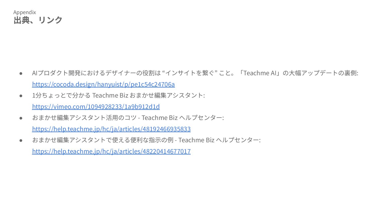Appendix 出典、リンク • AIプロダクト開発におけるデザイナーの役割は “インサイトを繋ぐ” こと。「Teachme AI」の⼤幅アップデートの裏側: https://cocoda.design/hanyuist/p/pe1c54c24706a • 1分ちょっとで分かる