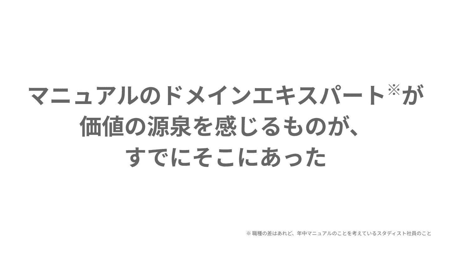 マニュアルのドメインエキスパート※が 価値の源泉を感じるものが、 すでにそこにあった ※ 職種の差はあれど、年中マニュアルのことを考えているスタディスト社員のこと