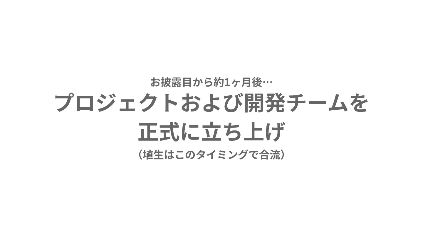 お披露⽬から約1ヶ⽉後… プロジェクトおよび開発チームを 正式に⽴ち上げ (埴⽣はこのタイミングで合流)