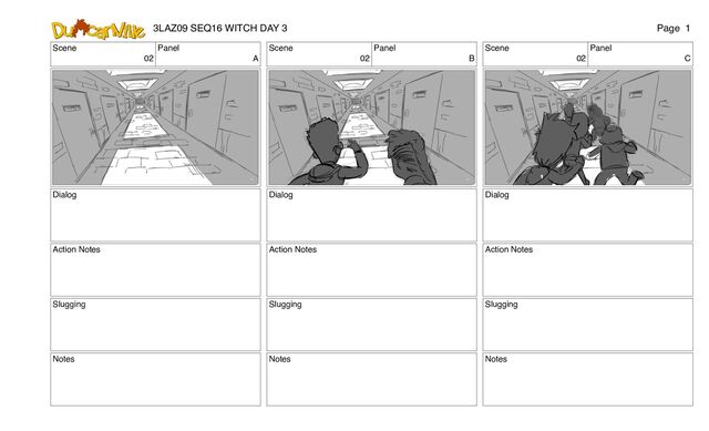 02 Panel B Dialog Action Notes Slugging Notes Scene 02 Panel C Dialog Action Notes Slugging Notes 3LAZ09 SEQ16 WITCH DAY 3 Page 1