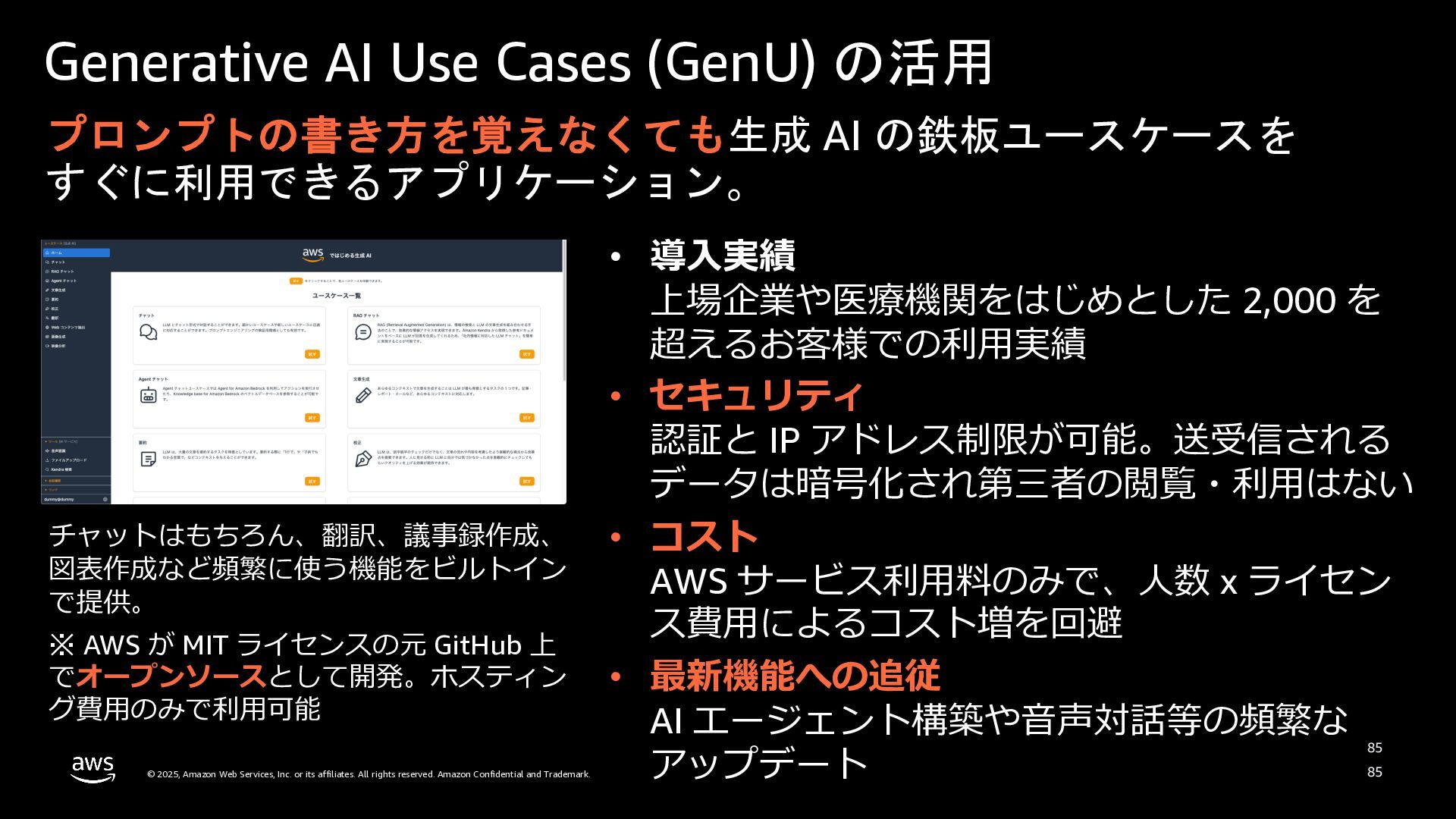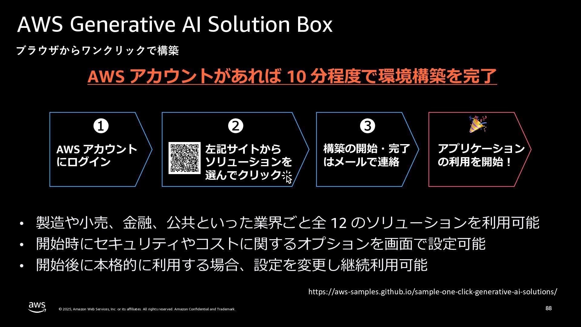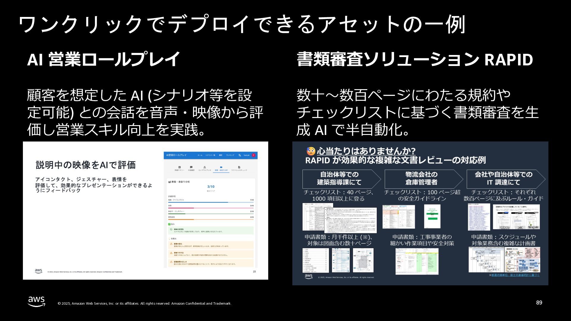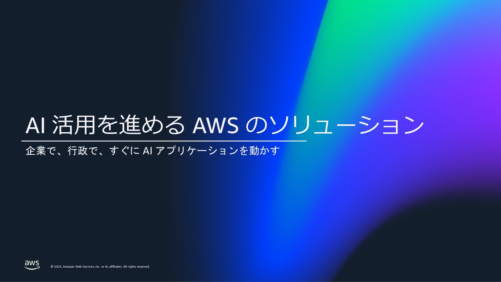 「AI活用を進めるAWSのソリューション」では、企業・自治体が「今日から動き出す」ための具体的な入り口を提示します。AI活用のゴールが「社員が生成AIを使える割合」から「生成AIが仕事を担えている割合」へとシフトしつつある今、プロンプトの知識がなくても鉄板ユースケースをすぐに使い始められるアプリケーションや、AWSアカウントがあれば10分程度で本番相当の環境が立ち上がるワンクリックデプロイの仕組みを紹介します。