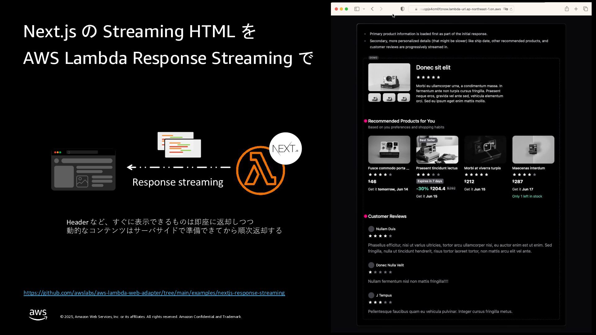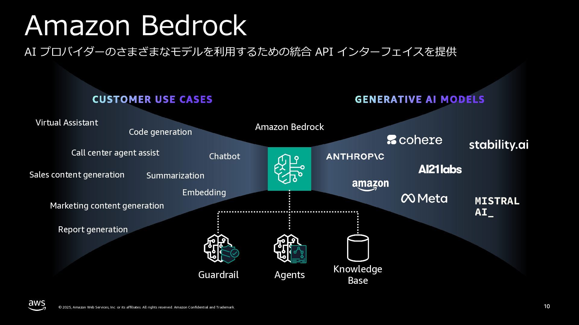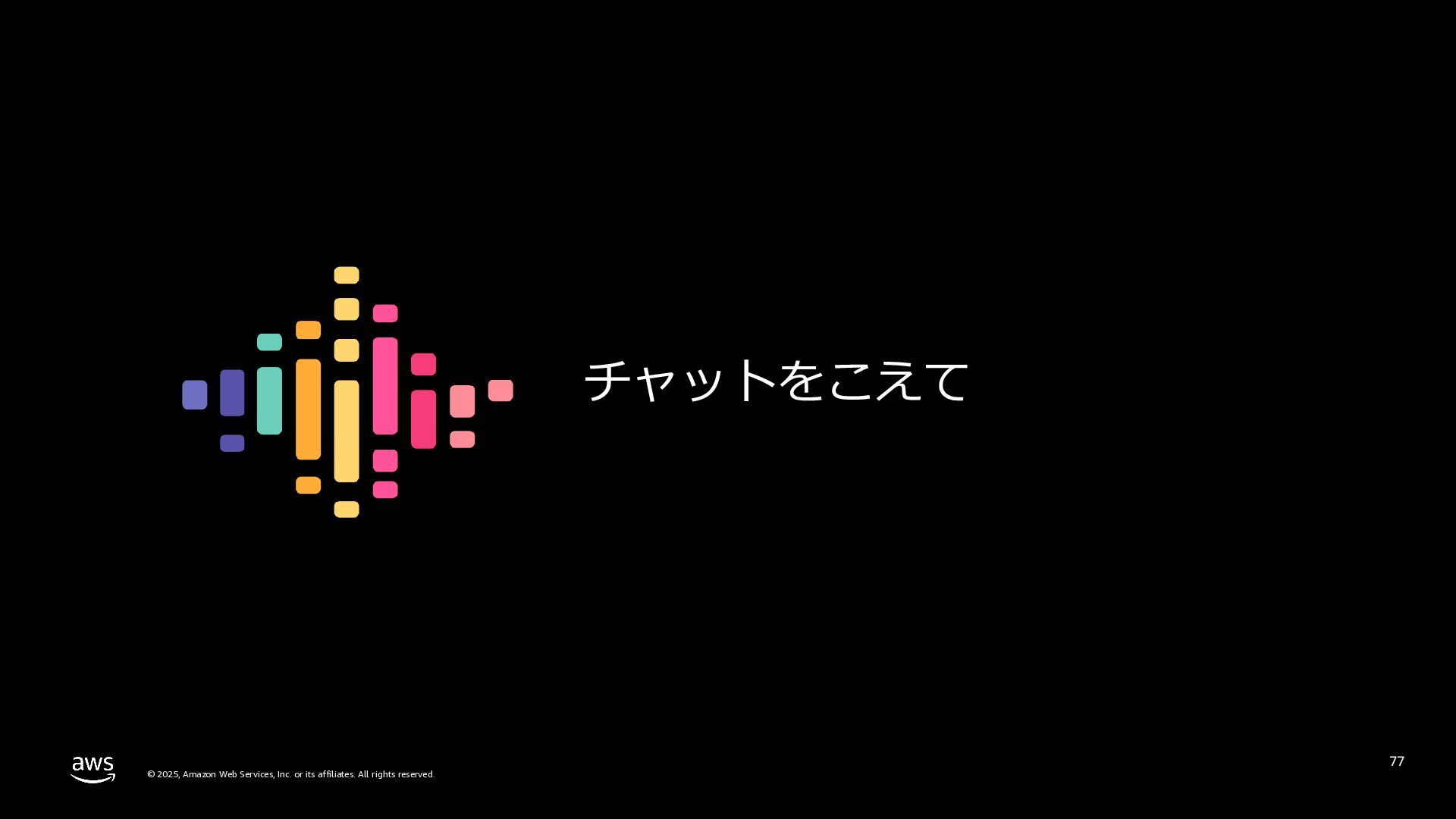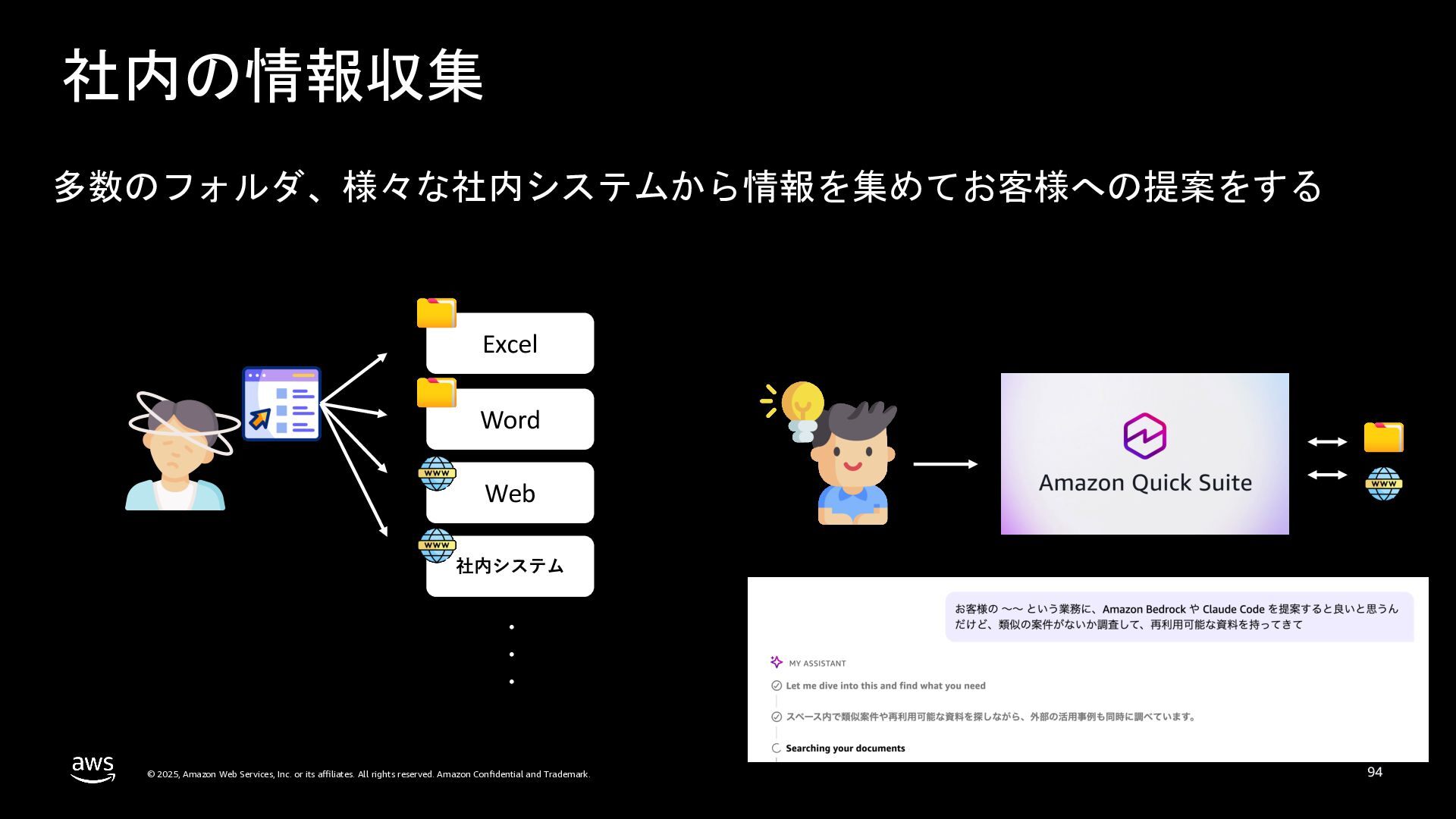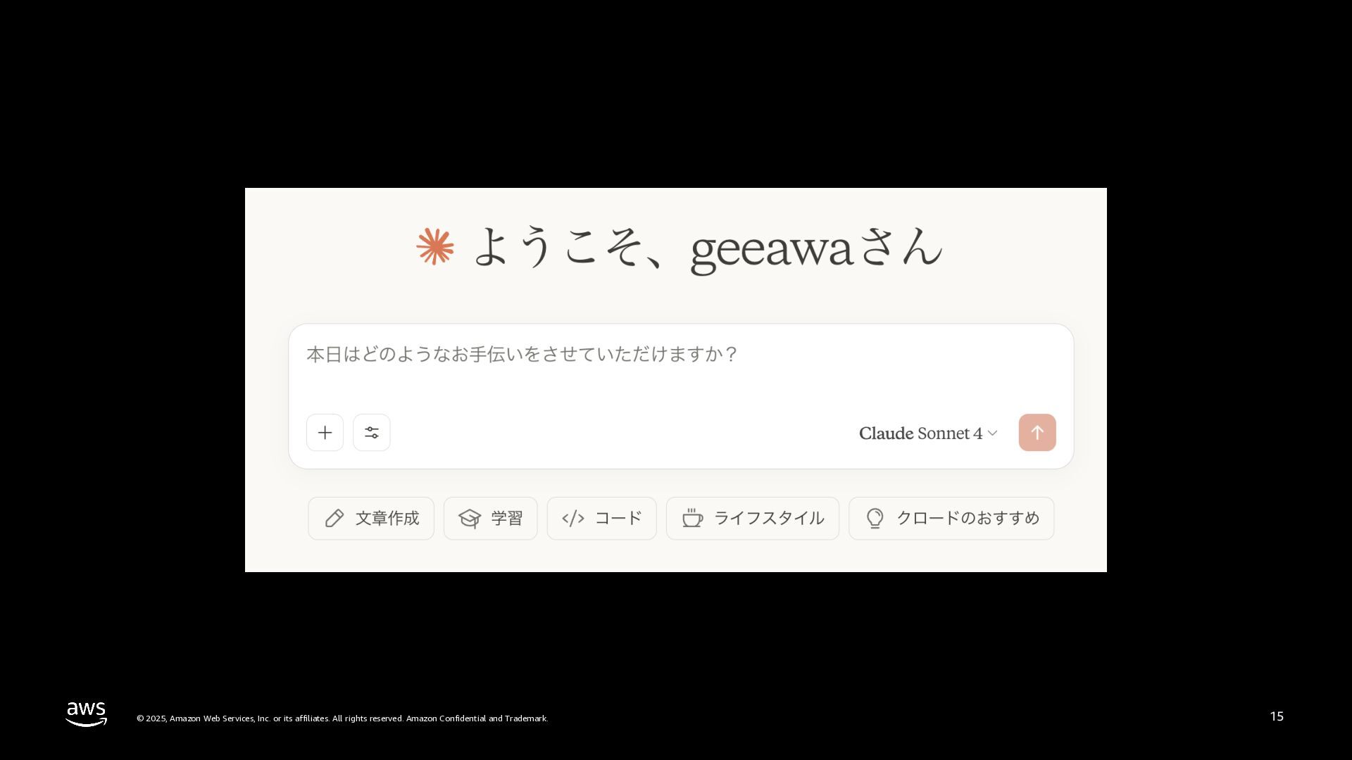 「AI活用を進めるAWSのソリューション」では、企業・自治体が「今日から動き出す」ための具体的な入り口を提示します。AI活用のゴールが「社員が生成AIを使える割合」から「生成AIが仕事を担えている割合」へとシフトしつつある今、プロンプトの知識がなくても鉄板ユースケースをすぐに使い始められるアプリケーションや、AWSアカウントがあれば10分程度で本番相当の環境が立ち上がるワンクリックデプロイの仕組みを紹介します。