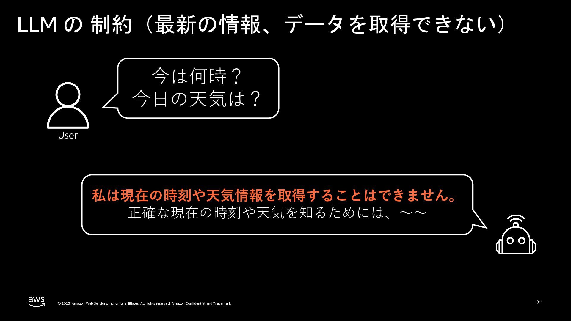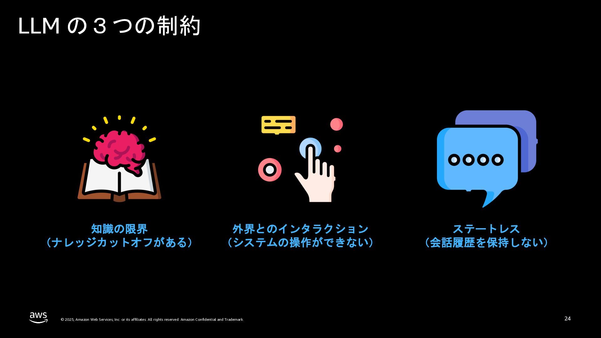 まず「AIエージェントの現在地」として、LLM・RAG・Agentという三つのキーワードがどのように関係し、どのような順序で技術が進化してきたかを、ゼロから丁寧に紐解きます。「LLMには3つの根本的な制約がある」「RAGはその一つを、Agentはその先を乗り越える技術だ」という視点で整理することで、個々の技術用語がバラバラに感じられていた方も、一本の筋が通った理解を得られるはずです。