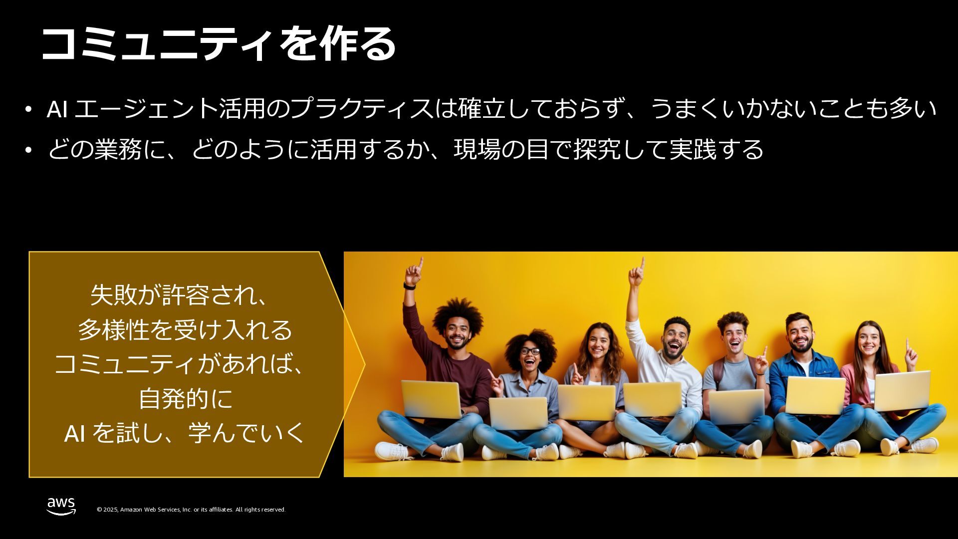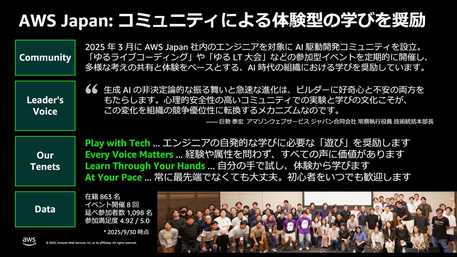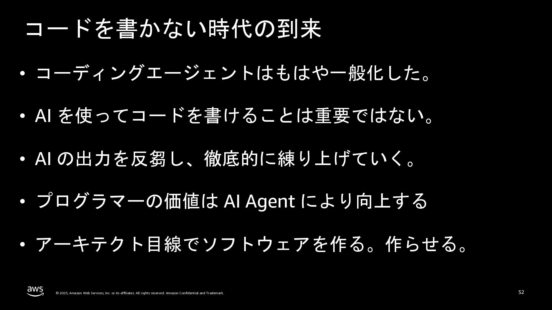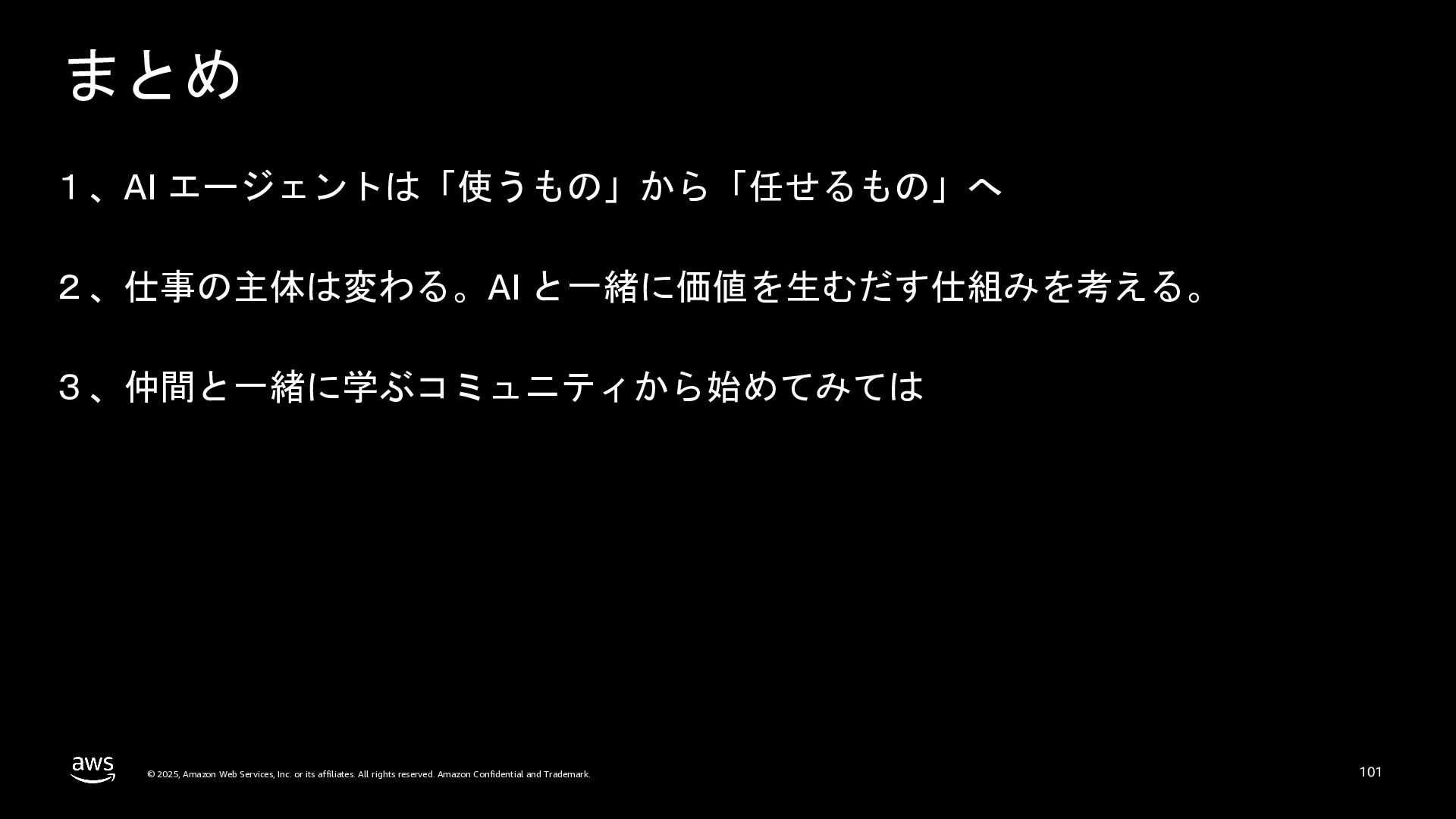 そして最後の「AI時代の人材」では、本セッション最大のテーマに踏み込みます。2025年以降、「人間が計画してAIをアシスタントとして使う」から「AIエージェントが計画して実行し、人間がレビューしてアドバイスを与える」という主体の逆転が静かに、しかし確実に進行しています。世界経済フォーラムの雇用レポートが示す「総雇用の22%に相当する構造変化」は、決して遠い未来の話ではありません。ただし、これは「仕事が奪われる」という単純な話ではなく、「新しく生まれる職種と能力をどう育てるか」という問いへの答えを、私たち一人ひとりが今考え始める必要があるという話です。エンジニアがAI駆動開発への不安と好奇心の両方を抱える中で、心理的安全性の高いコミュニティが果たす役割と、AWS Japan社内での実践例も交えながら、「使いこなす側になるための具体的な一歩」を提示します。