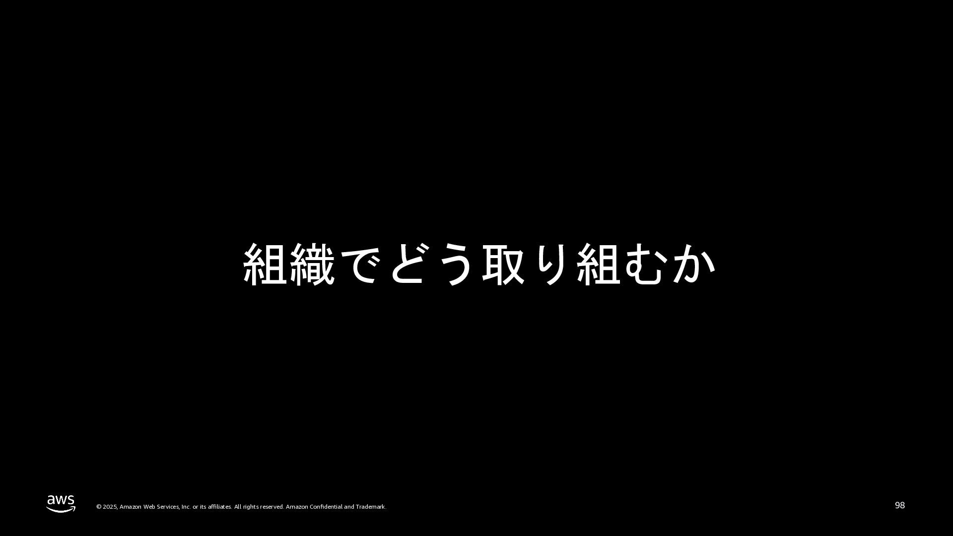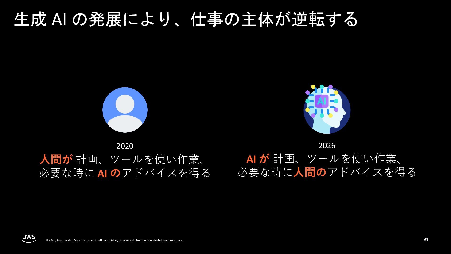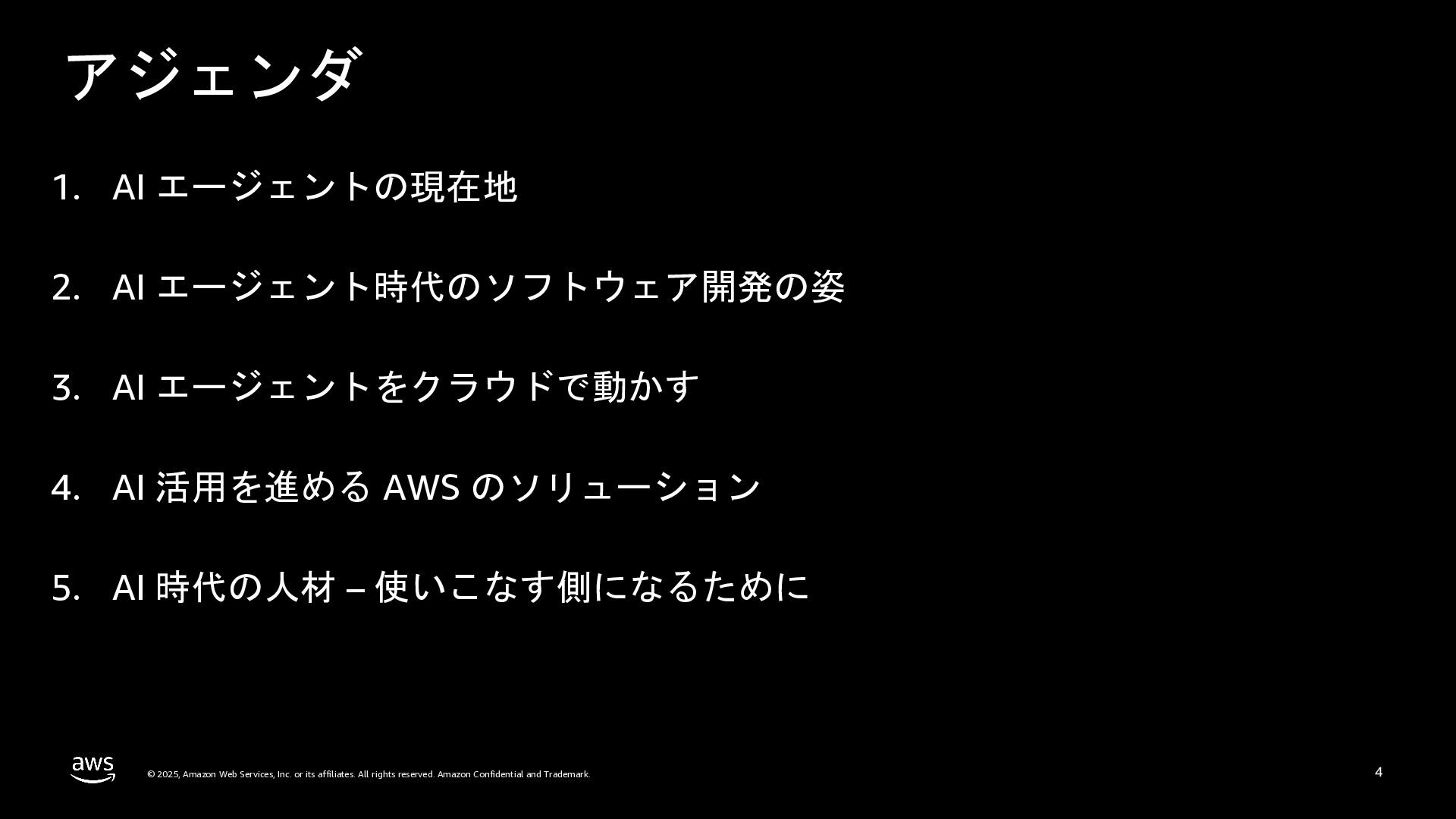 そして最後の「AI時代の人材」では、本セッション最大のテーマに踏み込みます。2025年以降、「人間が計画してAIをアシスタントとして使う」から「AIエージェントが計画して実行し、人間がレビューしてアドバイスを与える」という主体の逆転が静かに、しかし確実に進行しています。世界経済フォーラムの雇用レポートが示す「総雇用の22%に相当する構造変化」は、決して遠い未来の話ではありません。ただし、これは「仕事が奪われる」という単純な話ではなく、「新しく生まれる職種と能力をどう育てるか」という問いへの答えを、私たち一人ひとりが今考え始める必要があるという話です。エンジニアがAI駆動開発への不安と好奇心の両方を抱える中で、心理的安全性の高いコミュニティが果たす役割と、AWS Japan社内での実践例も交えながら、「使いこなす側になるための具体的な一歩」を提示します。
