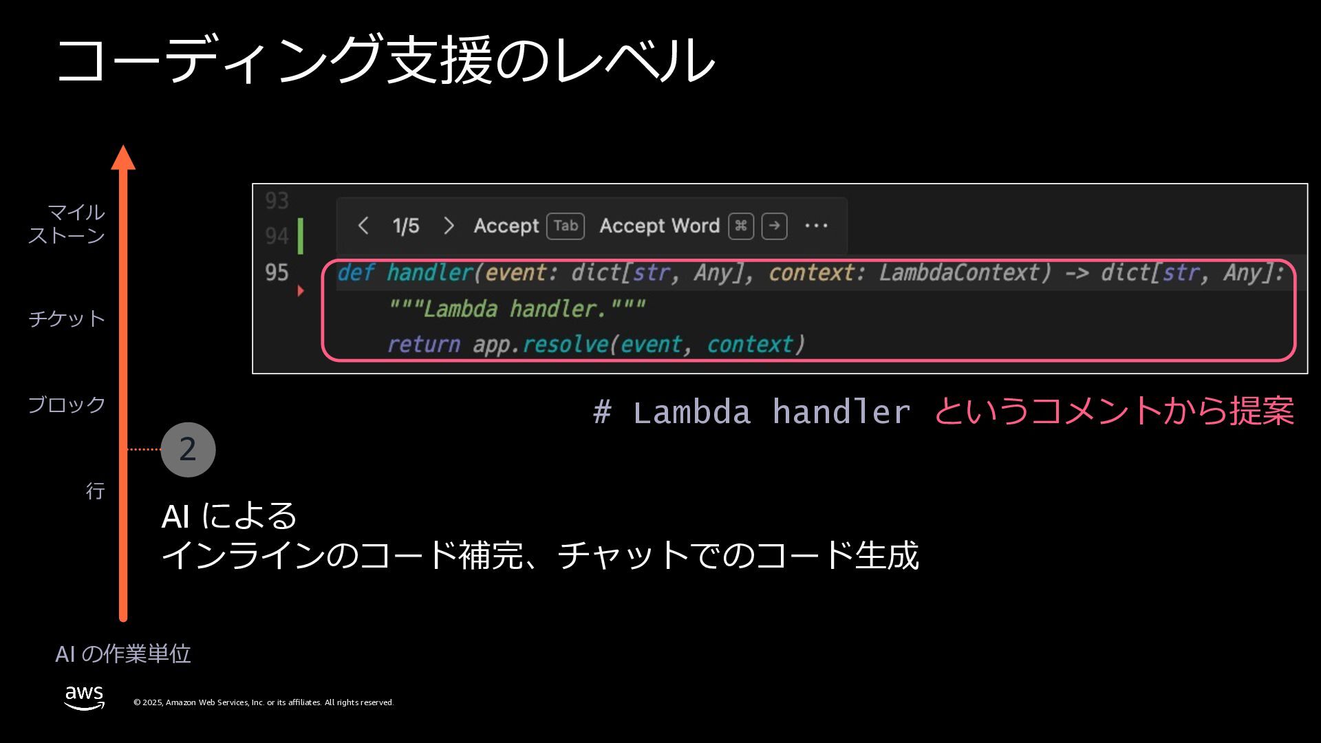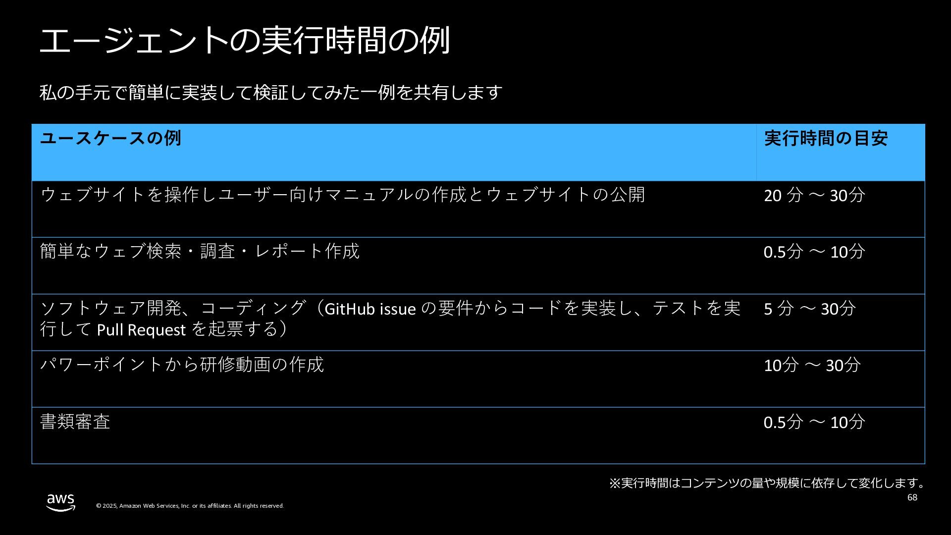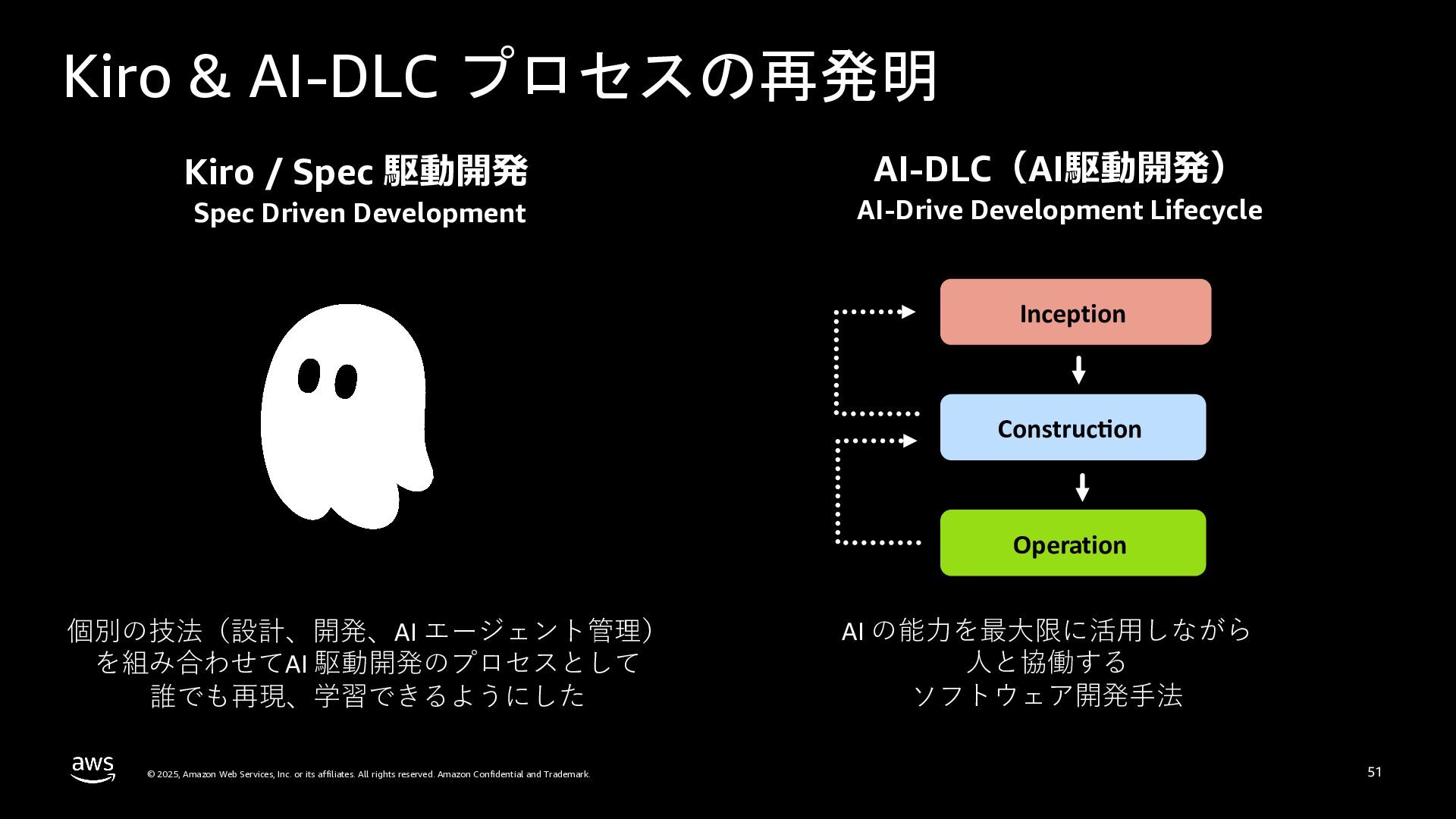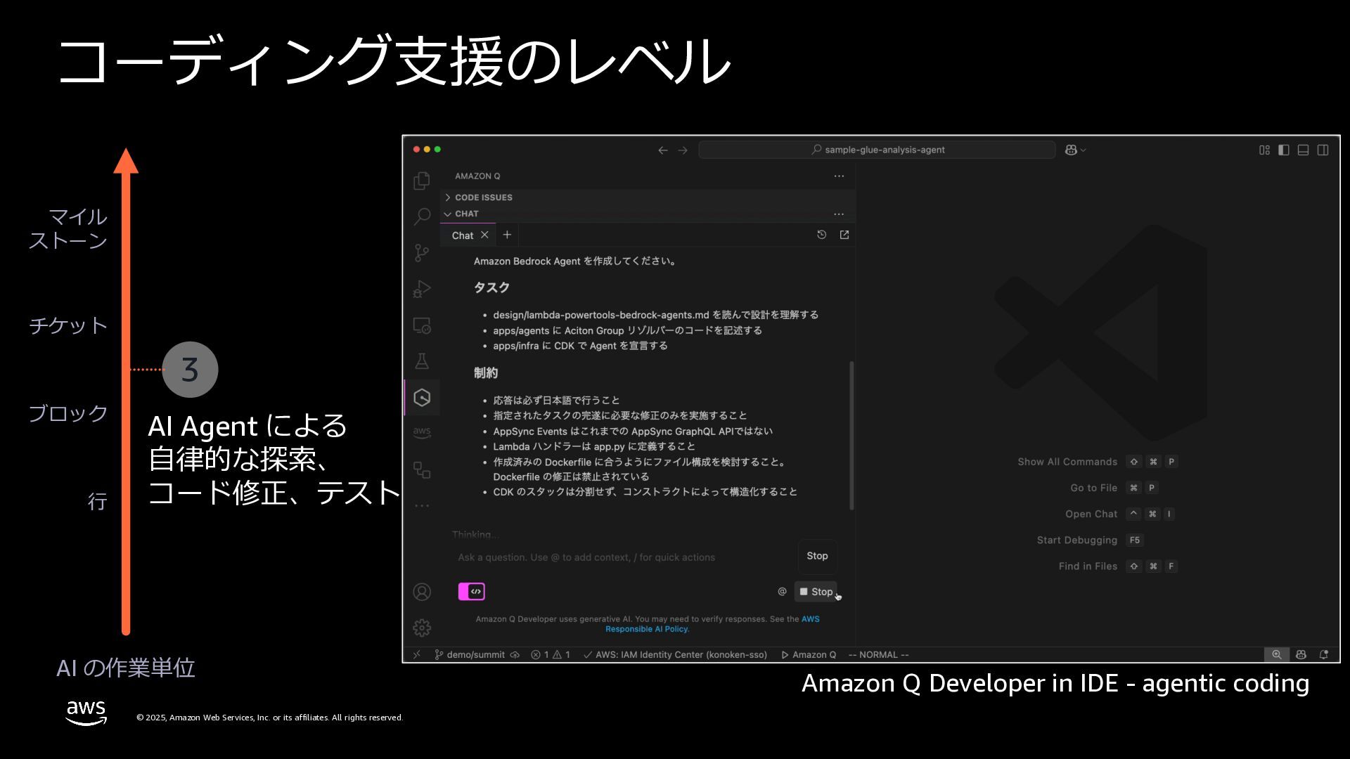 そして最後の「AI時代の人材」では、本セッション最大のテーマに踏み込みます。2025年以降、「人間が計画してAIをアシスタントとして使う」から「AIエージェントが計画して実行し、人間がレビューしてアドバイスを与える」という主体の逆転が静かに、しかし確実に進行しています。世界経済フォーラムの雇用レポートが示す「総雇用の22%に相当する構造変化」は、決して遠い未来の話ではありません。ただし、これは「仕事が奪われる」という単純な話ではなく、「新しく生まれる職種と能力をどう育てるか」という問いへの答えを、私たち一人ひとりが今考え始める必要があるという話です。エンジニアがAI駆動開発への不安と好奇心の両方を抱える中で、心理的安全性の高いコミュニティが果たす役割と、AWS Japan社内での実践例も交えながら、「使いこなす側になるための具体的な一歩」を提示します。
