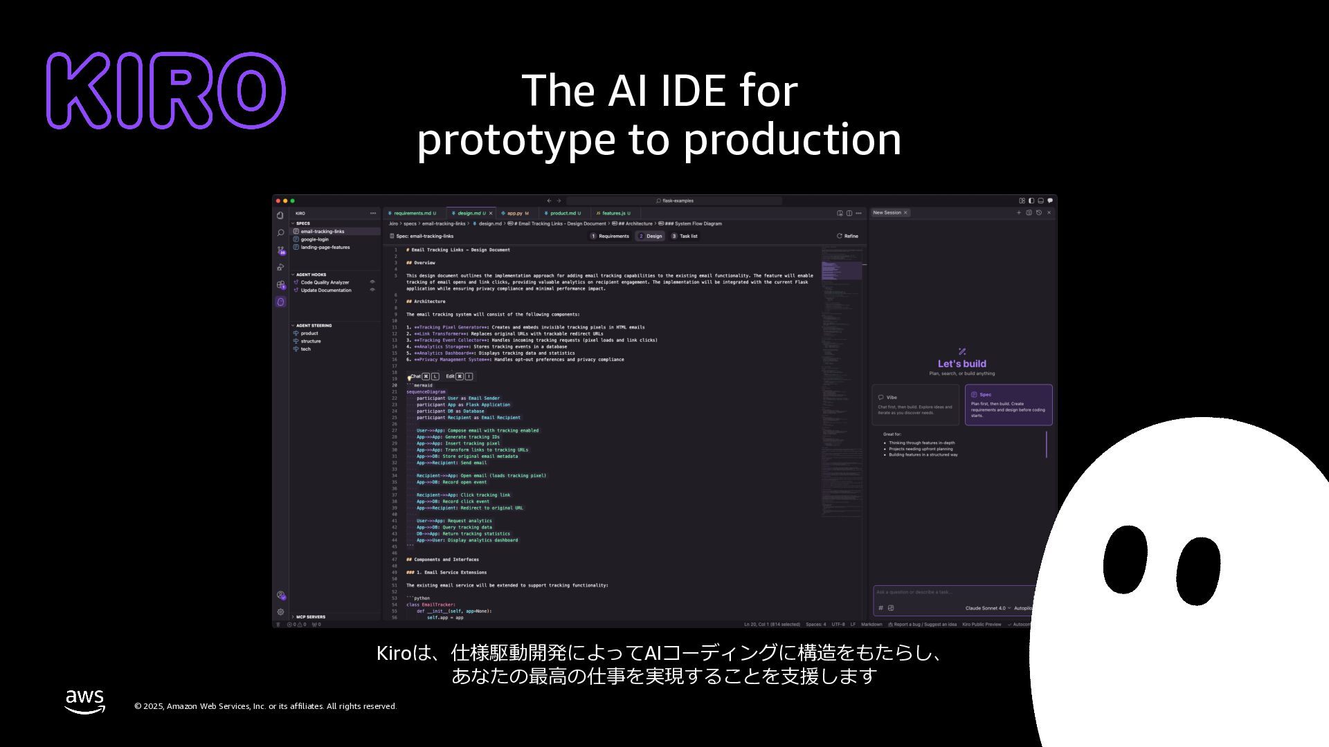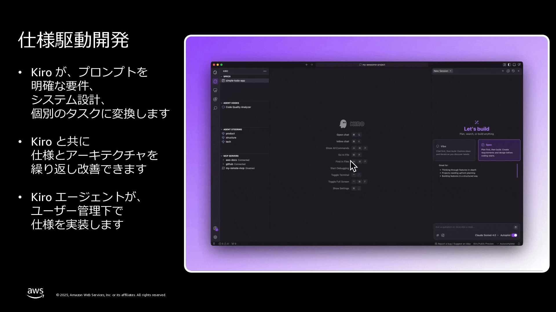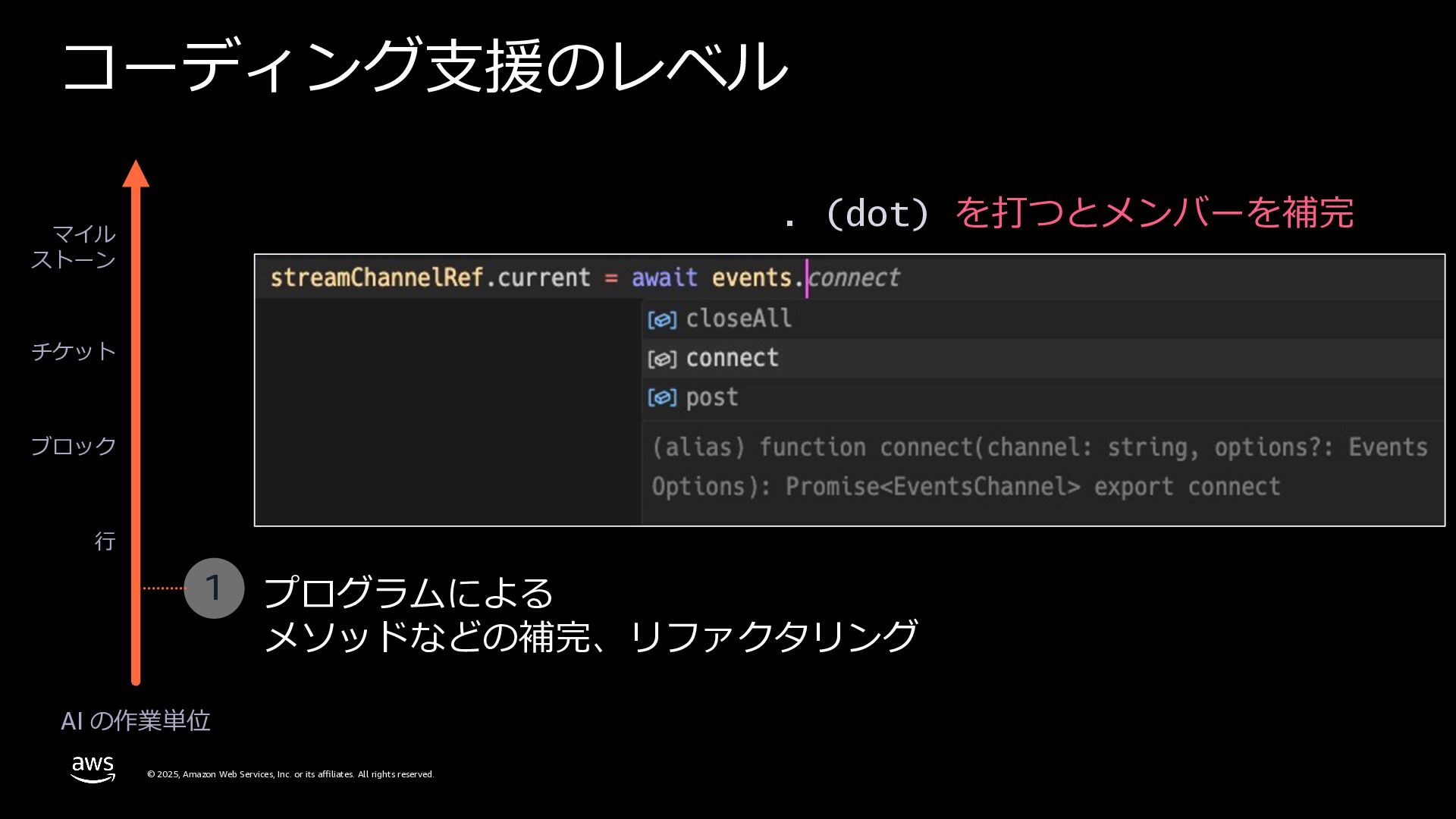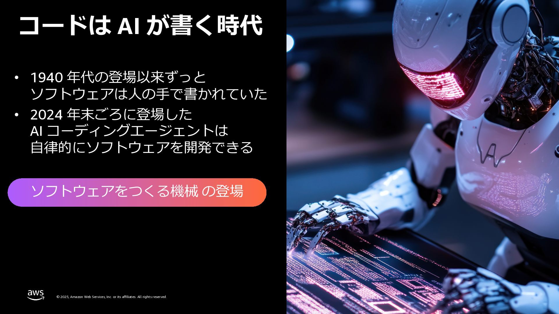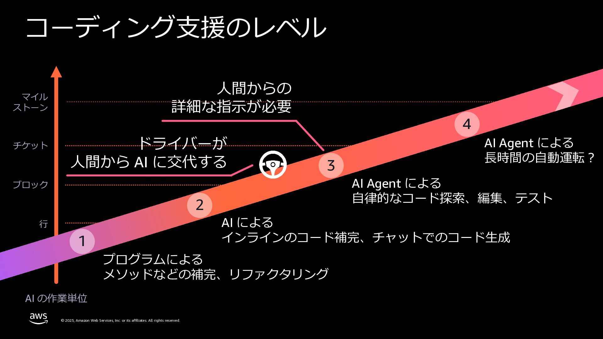 次に「AIエージェント時代のソフトウェア開発の姿」として、コーディングエージェントの登場が開発の現場に何をもたらしているかを論じます。1940年代の登場以来80年間、ソフトウェアは「人間が一行ずつ書くもの」でした。ところがKiro、Cline、Cursorに代表されるAIコーディングエージェントの登場により、その前提が崩れ始めています。コーディング支援のレベルを「行単位の補完」から「マイルストーン単位の自律開発」まで4段階に整理しながら、「コードを書く能力」よりも「アーキテクト目線でAIに作らせる能力」がより重要になっていく構造的な変化を示します。