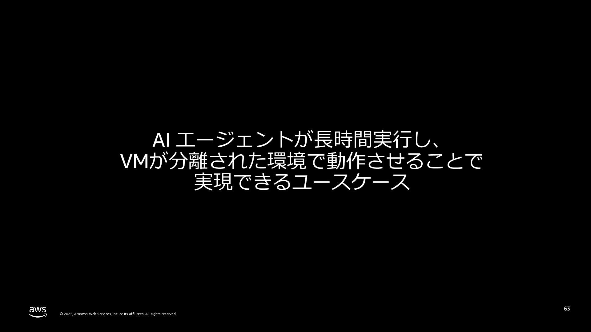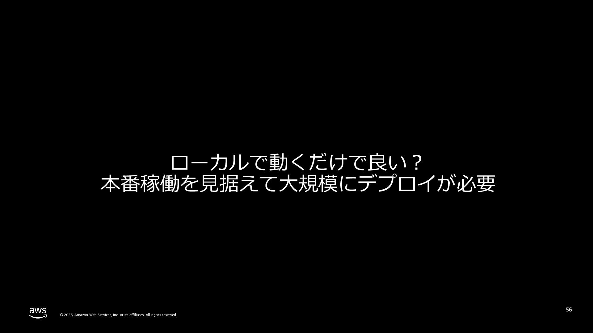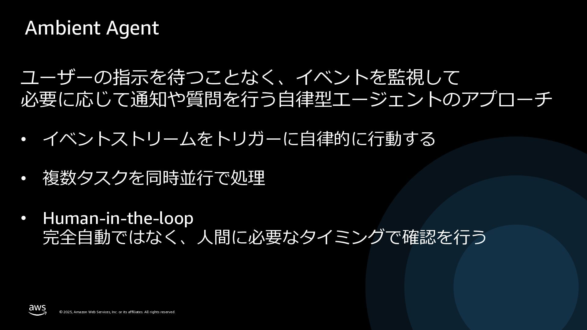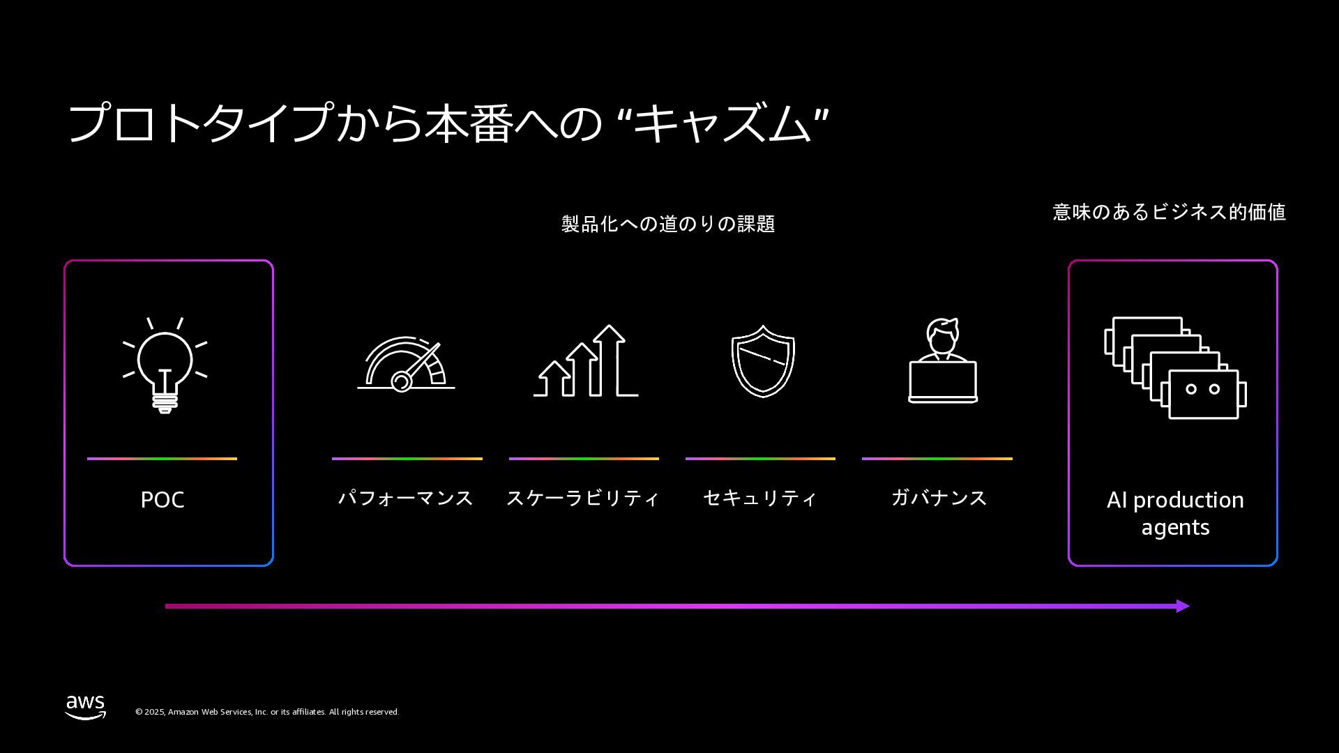 続いて「AIエージェントをクラウドで動かす」では、PoC止まりになりがちなAIエージェント開発が抱える「プロトタイプから本番へのキャズム」を正面から取り上げます。長時間実行・セッション分離・スケーラビリティ・セキュリティ——AIエージェント特有の要件を踏まえたアーキテクチャ設計の考え方と、Amazon Bedrock AgentCoreが提供するフルマネージドなエージェントランタイム・ゲートウェイ・アンビエントエージェントといった概念を、実際に手元で動かしたデモの成果物を見せながら紹介します。「20〜30分かけて自律的に仕事を届けるエージェント」のリアリティを、数字と映像で体感していただけるはずです。