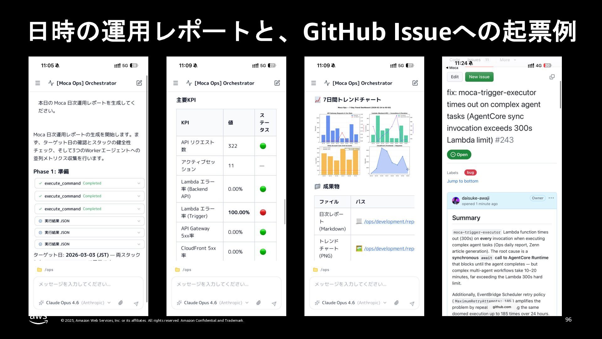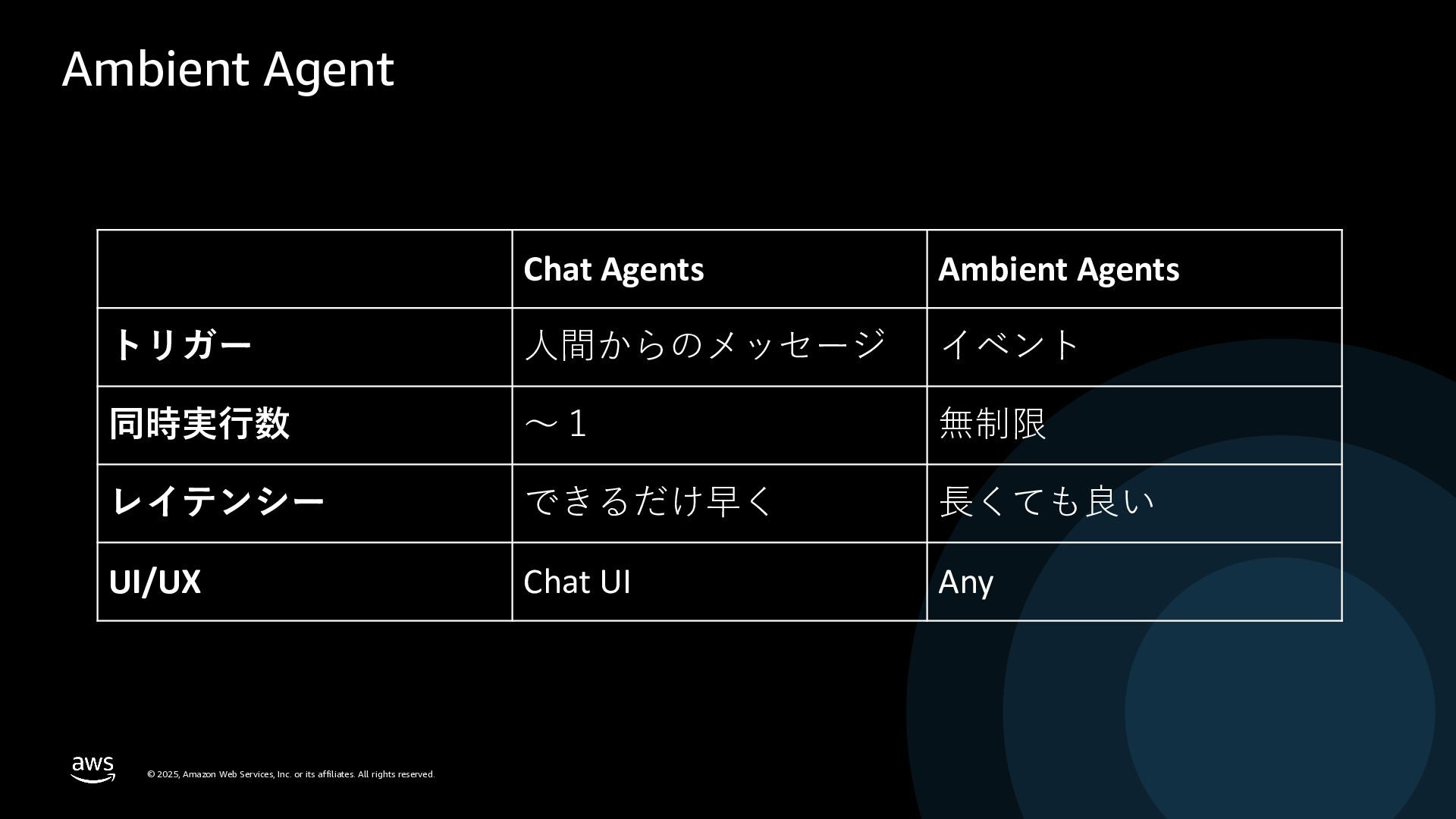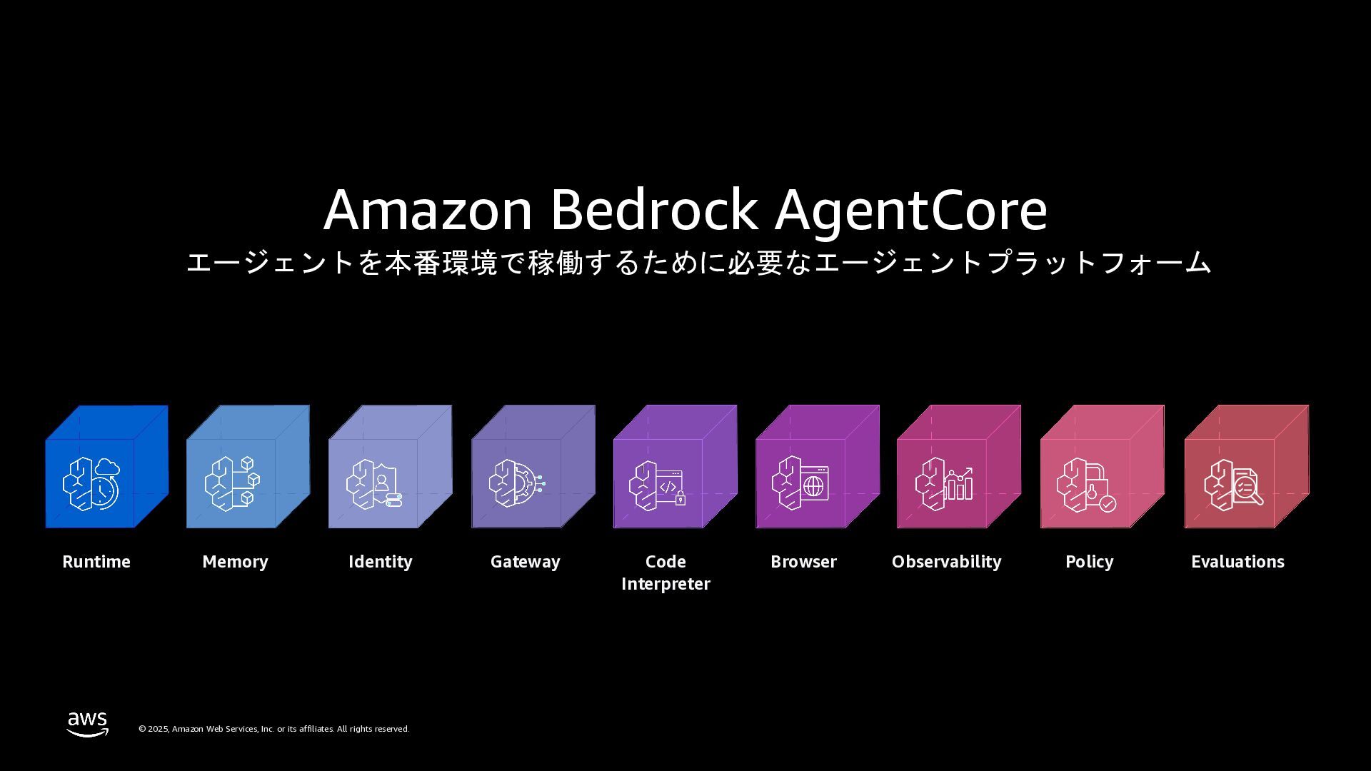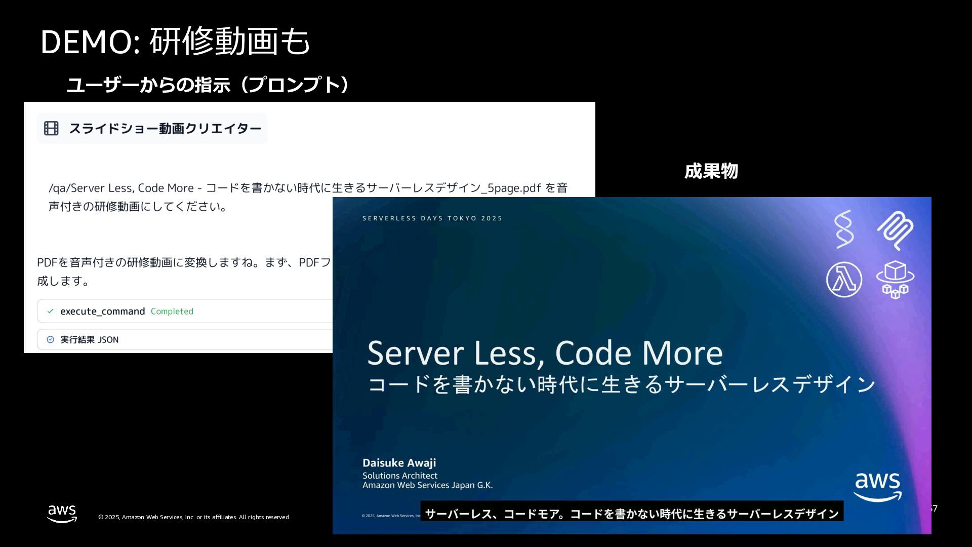 続いて「AIエージェントをクラウドで動かす」では、PoC止まりになりがちなAIエージェント開発が抱える「プロトタイプから本番へのキャズム」を正面から取り上げます。長時間実行・セッション分離・スケーラビリティ・セキュリティ——AIエージェント特有の要件を踏まえたアーキテクチャ設計の考え方と、Amazon Bedrock AgentCoreが提供するフルマネージドなエージェントランタイム・ゲートウェイ・アンビエントエージェントといった概念を、実際に手元で動かしたデモの成果物を見せながら紹介します。「20〜30分かけて自律的に仕事を届けるエージェント」のリアリティを、数字と映像で体感していただけるはずです。