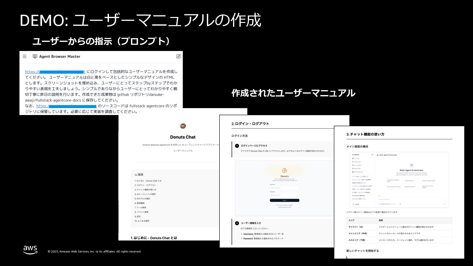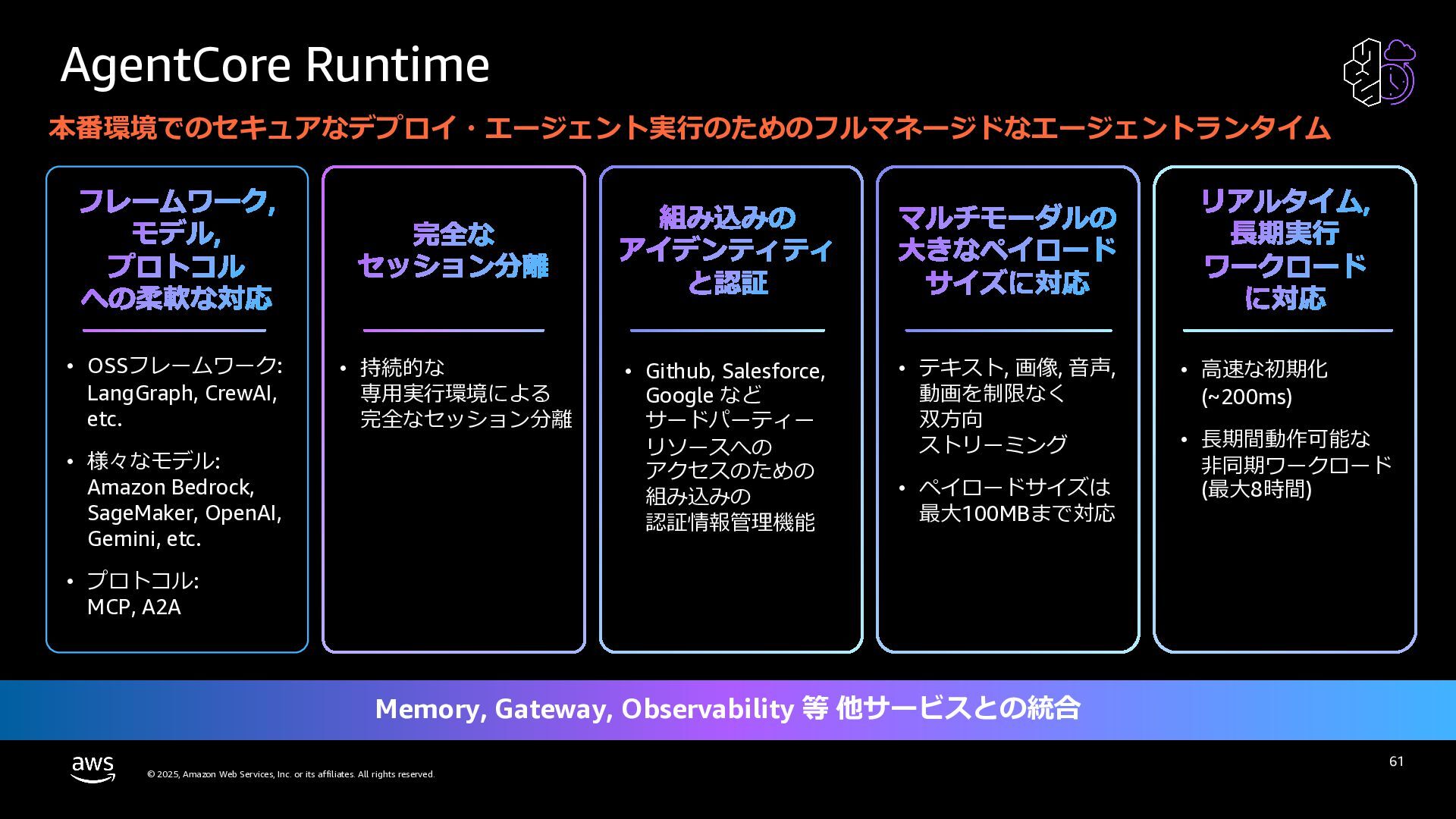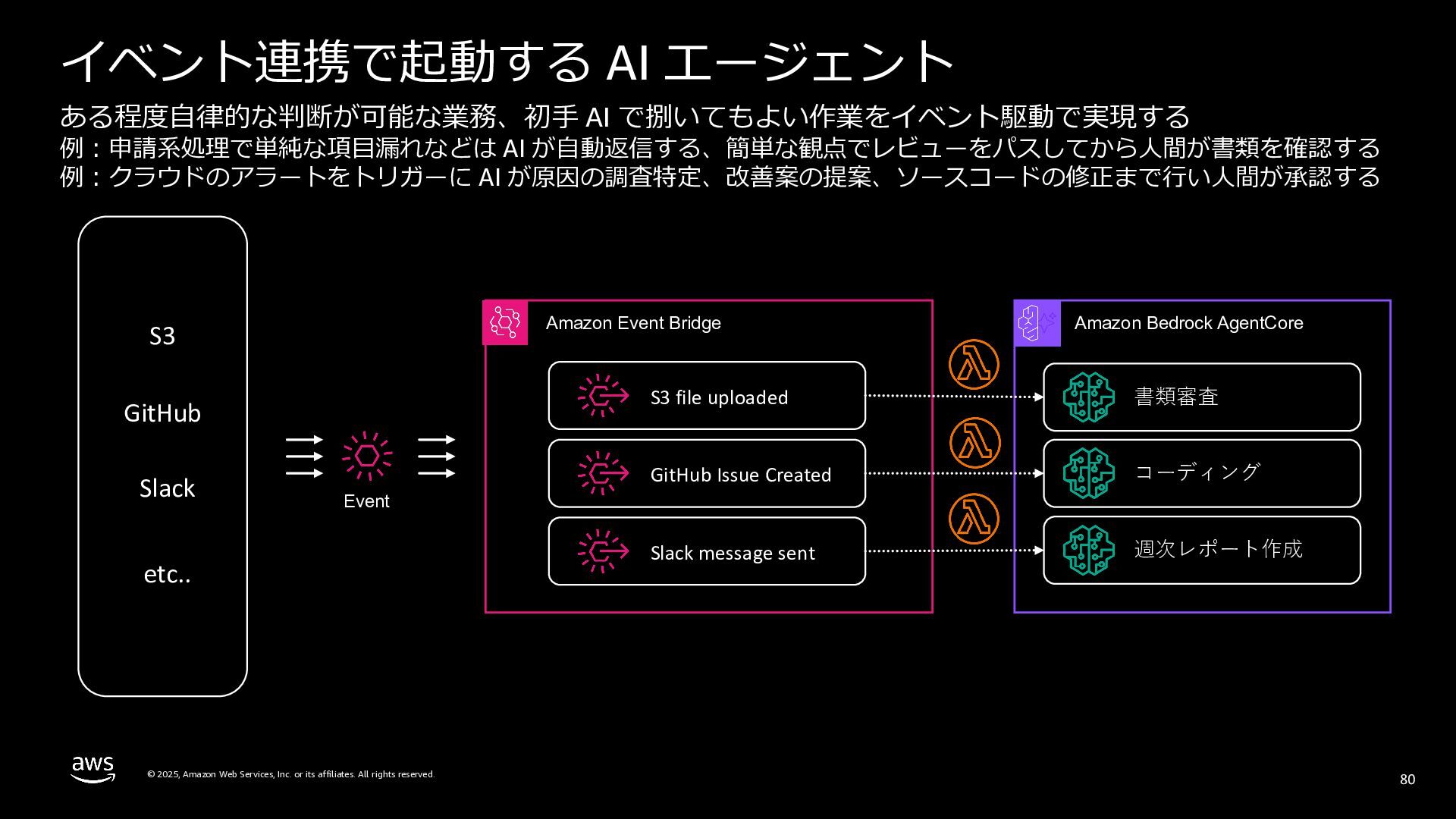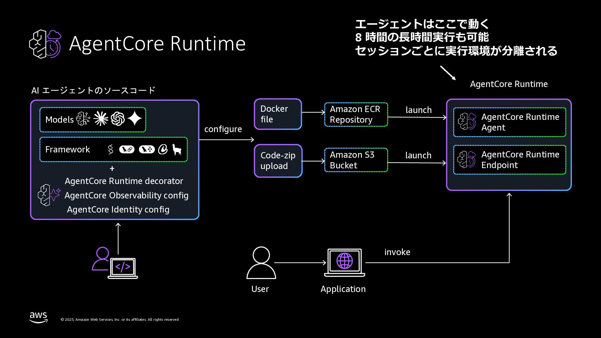 続いて「AIエージェントをクラウドで動かす」では、PoC止まりになりがちなAIエージェント開発が抱える「プロトタイプから本番へのキャズム」を正面から取り上げます。長時間実行・セッション分離・スケーラビリティ・セキュリティ——AIエージェント特有の要件を踏まえたアーキテクチャ設計の考え方と、Amazon Bedrock AgentCoreが提供するフルマネージドなエージェントランタイム・ゲートウェイ・アンビエントエージェントといった概念を、実際に手元で動かしたデモの成果物を見せながら紹介します。「20〜30分かけて自律的に仕事を届けるエージェント」のリアリティを、数字と映像で体感していただけるはずです。