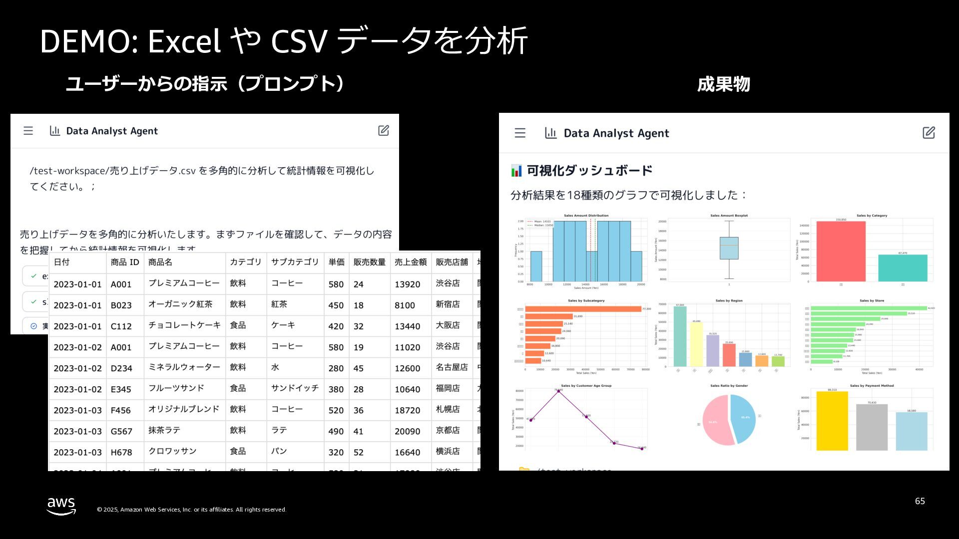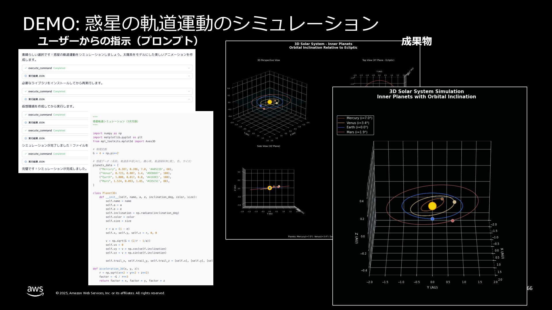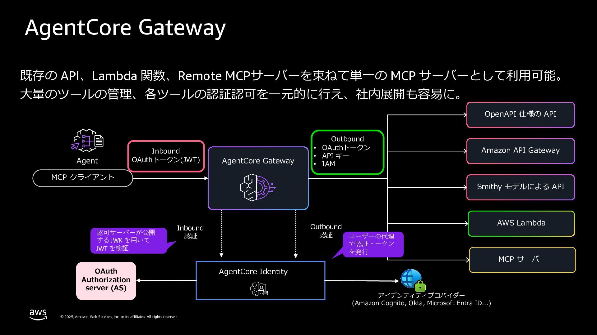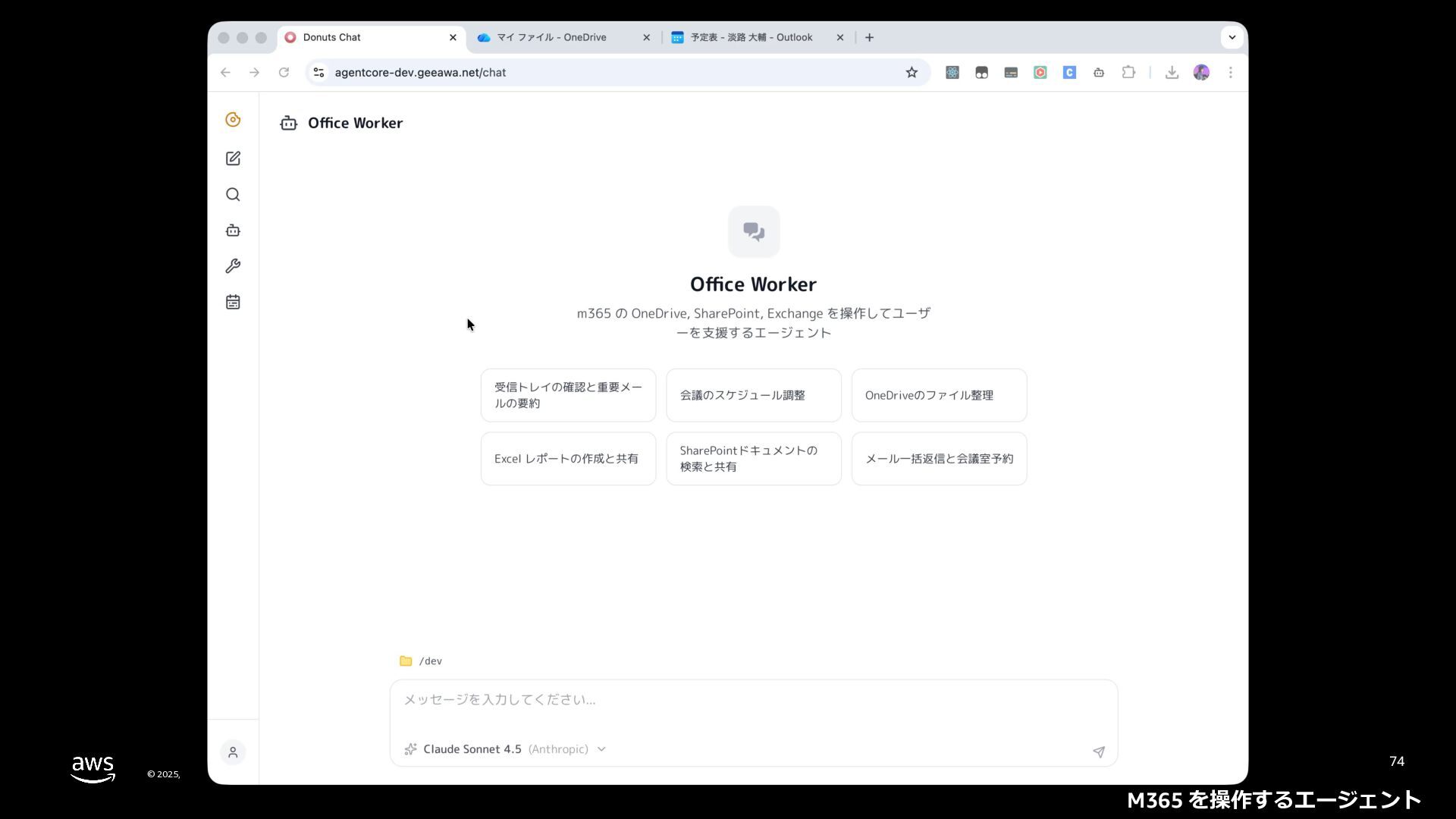 続いて「AIエージェントをクラウドで動かす」では、PoC止まりになりがちなAIエージェント開発が抱える「プロトタイプから本番へのキャズム」を正面から取り上げます。長時間実行・セッション分離・スケーラビリティ・セキュリティ——AIエージェント特有の要件を踏まえたアーキテクチャ設計の考え方と、Amazon Bedrock AgentCoreが提供するフルマネージドなエージェントランタイム・ゲートウェイ・アンビエントエージェントといった概念を、実際に手元で動かしたデモの成果物を見せながら紹介します。「20〜30分かけて自律的に仕事を届けるエージェント」のリアリティを、数字と映像で体感していただけるはずです。