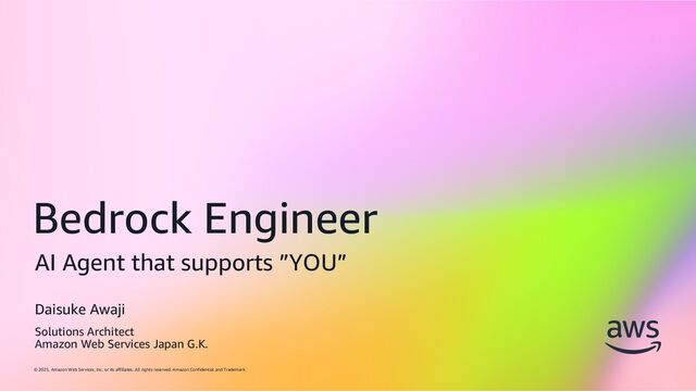 rights reserved. Amazon Confidential and Trademark. © 2025, Amazon Web Services, Inc. or its affiliates. All rights reserved. Amazon Confidential and Trademark. AI Agent that supports ”YOU” Daisuke Awaji Solutions Architect Amazon Web Services Japan G.K. Bedrock Engineer