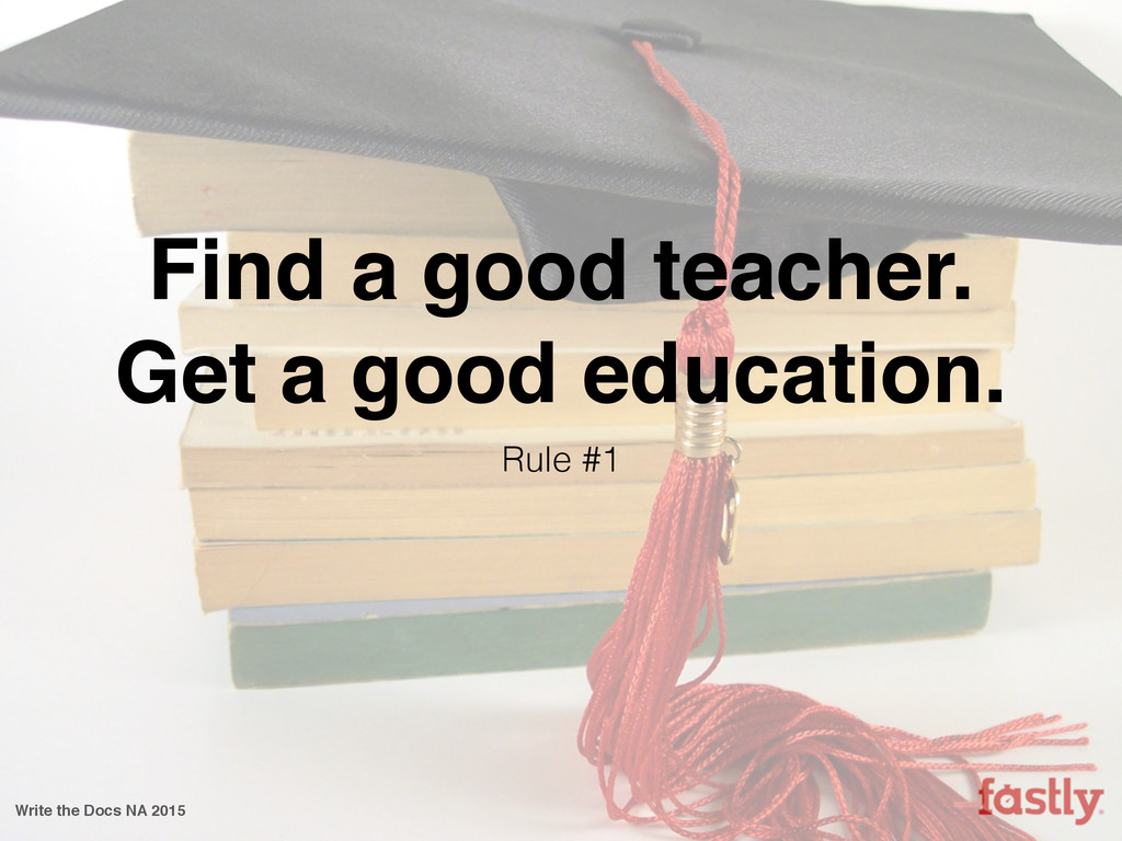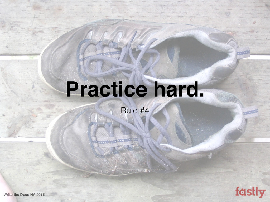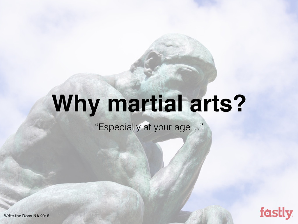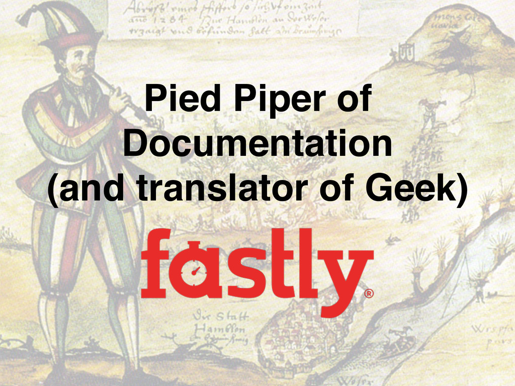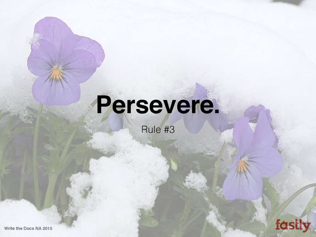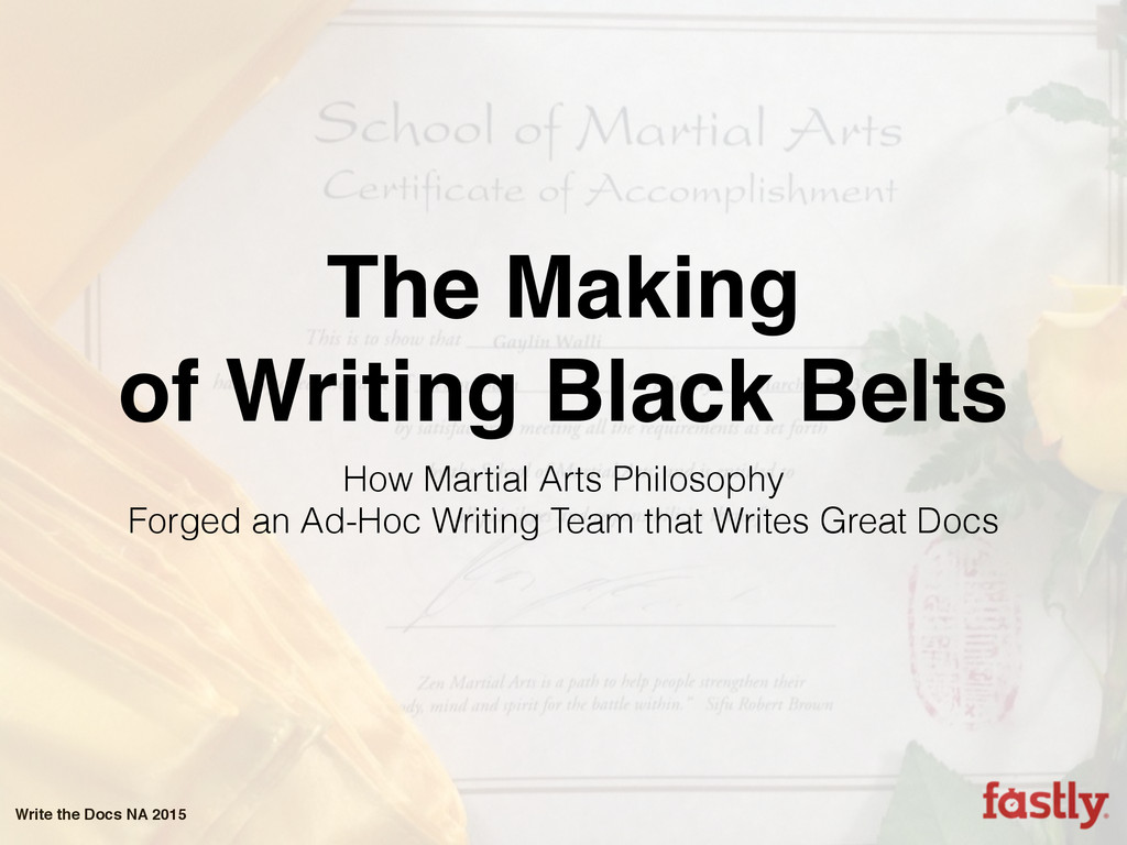 In this talk I’ll discuss how my company has unwittingly followed the seven (and a half) rules I normally associate with becoming a great martial artist. I’ll discuss how we’ve been using these rules to forge an amazing ad-hoc documentation team with no formal department and no squad of strategically placed technical writers. I’ll talk about how my company has managed it despite the obstacles of startup life, including moving seven times and growing from less than 30 employees when I first joined to a throng of more than 150 a mere year and a half later. Finally, I’ll point out some of our successes, a few of our failures, and how each of the seven (and a half) rules has taught us what it means to write Fastly.