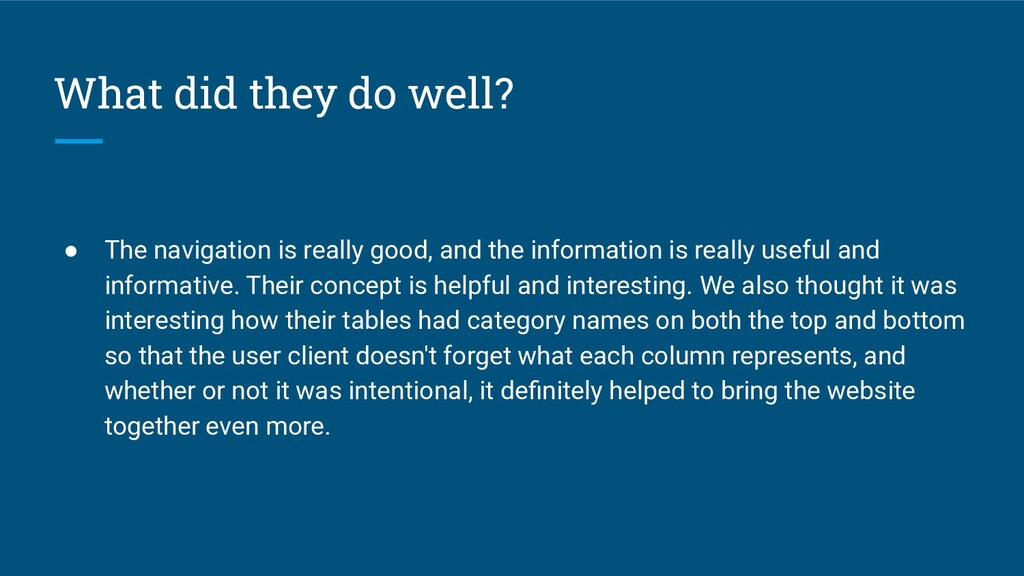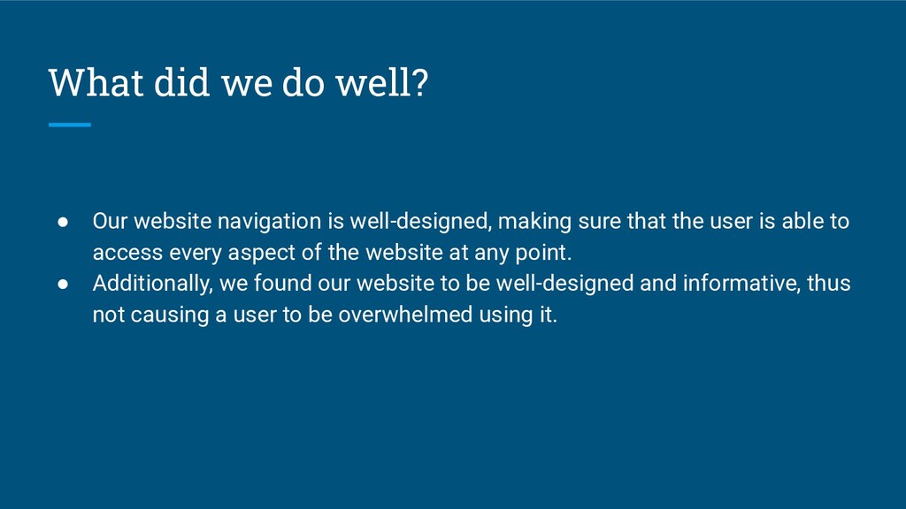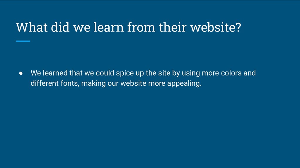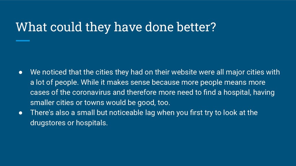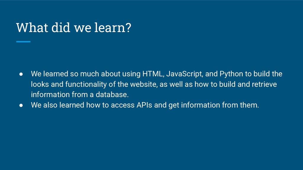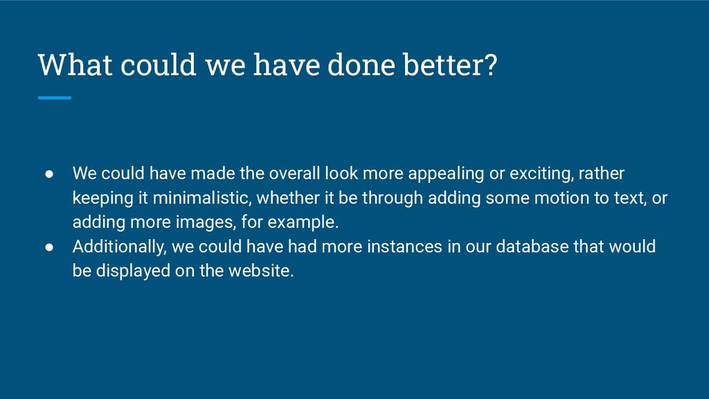 made the overall look more appealing or exciting, rather keeping it minimalistic, whether it be through adding some motion to text, or adding more images, for example. • Additionally, we could have had more instances in our database that would be displayed on the website.