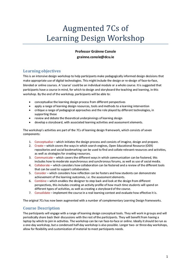 [email protected] Learning objectives This is an intensive design workshop to help participants make pedagogically informed design decisions that make appropriate use of digital technologies. This might include the design or re-design of face-to-face, blended or online courses. A ‘course’ could be an individual module or a whole course. It is suggested that participants have a course in mind, for which to design and storyboard the teaching and learning, in this workshop. By the end of the workshop, participants will be able to: • conceptualise the learning design process from different perspectives • apply a range of learning design resources, tools and methods to a learning intervention • critique a range of pedagogical approaches and the role played by different technologies, in supporting these • review and debate the theoretical underpinnings of learning design • develop a storyboard, with associated learning activities and assessment elements. The workshop’s activities are part of the 7Cs of learning design framework, which consists of seven components: 1. Conceptualise – which initiates the design process and consists of imagine, design and prepare. 2. Create – which covers the ways in which search engines, Open Educational Resource (OER) repositories and social bookmarking can be used to find and collate relevant resources and activities, as well as strategies for creating resources. 3. Communicate – which covers the different ways in which communication can be fostered, this includes how to moderate asynchronous and synchronous forums, as well as use of social media. 4. Collaborate – which considers how collaboration can be fostered and a review of the different tools that can be used to support collaboration. 5. Consider – which considers how reflection can be fosters and how students can demonstrate achievement of the learning outcomes, i.e. the assessment elements. 6. Combine – which enables the designer to step back and look at the design from different perspectives, this includes creating an activity profile of how much time students will spend on different types of activities, as well as creating a storyboard of the course. 7. Consolidate – implement the course in a real learning context and evaluate how effective it is. The original 7Cs has now been augmented with a number of complementary Learning Design frameworks. Course Description The participants will engage with a range of learning design conceptual tools. They will work in groups and will periodically share back their discussions with the rest of the participants. They will benefit from having a laptop by which to join in activities. The workshop can be run face-to-face or online. Ideally it should be run as a one-day workshop, but a condensed half-day workshop is also possible. Longer two- or three-day workshops, allow for flexibility and customization of material to meet participants needs.