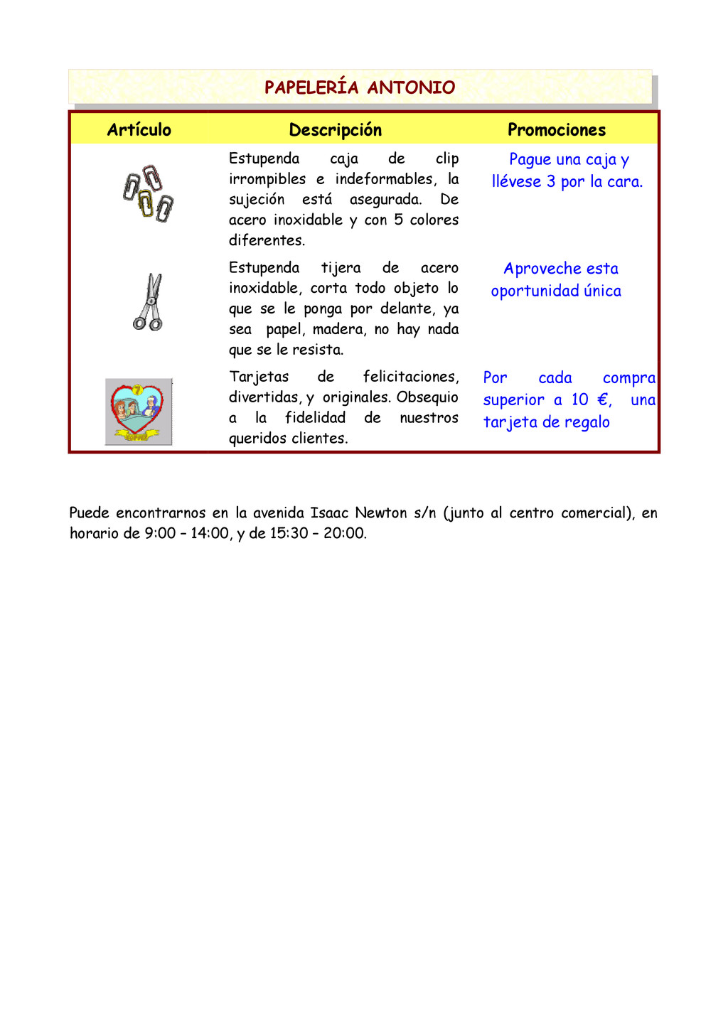1. PAPELERÍA ANTONIO Artículo Descripción Promociones Estupenda caja de clip irrompibles