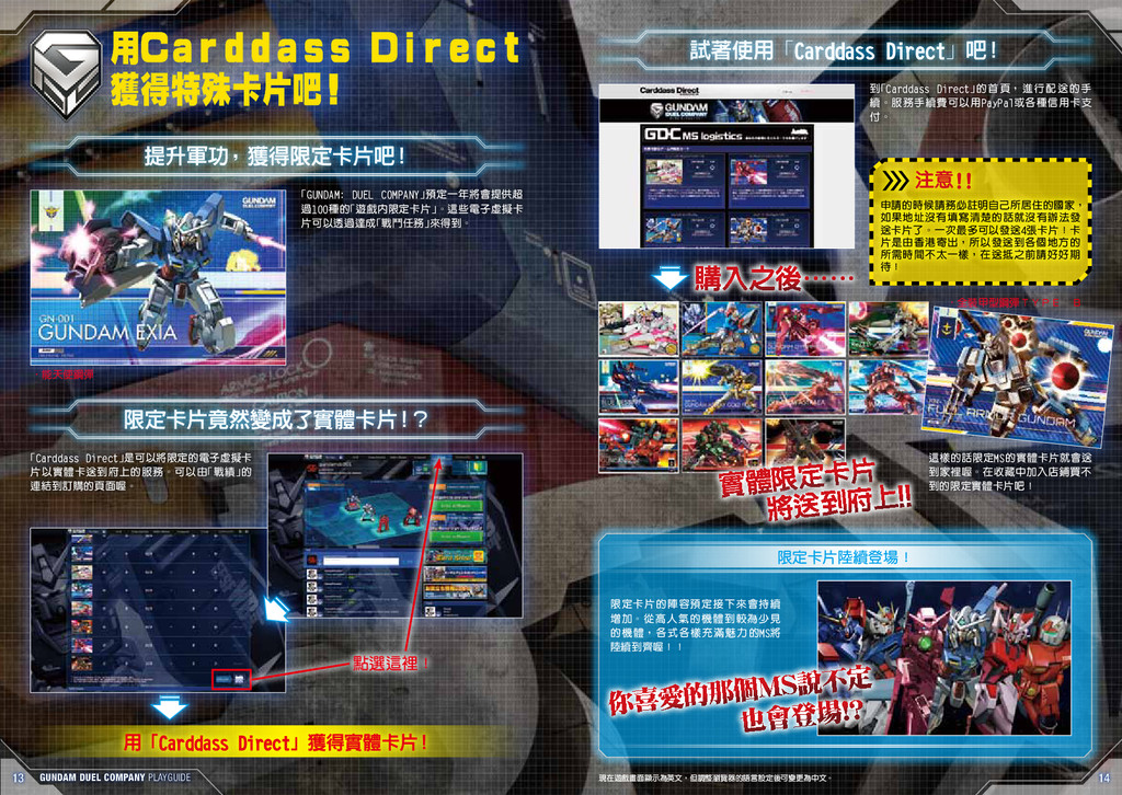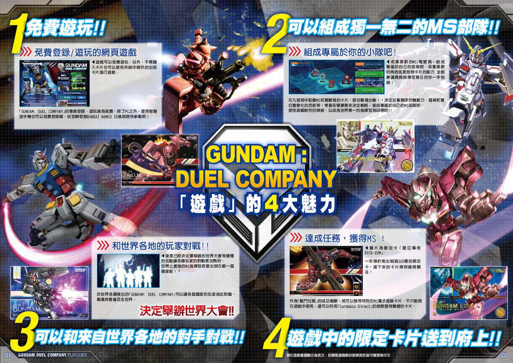結合集換式卡片與網頁遊戲的鋼彈最新作GUNDAM: DUEL COMPANY中文版遊戲說明。針對卡片、遊戲模式、限定卡送到府上的服務都有相關介紹!免費登錄、遊玩!GDC官方網站:gundam-dc.com/