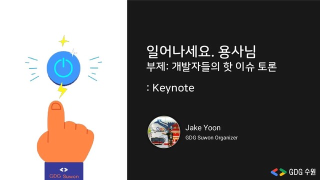 22:10 Keynote 윤재석 GDG Suwon Organizer 22:15 - 22:55 주제 1 토론 A – 개발자 연봉 이대로 괜찮은가 B – 개발자와 재테크 22:55 - 23:05 Break Time 23:05 - 23:45 주제2 토론 A – 코딩테스트의 필요성 B – 이직 꿀팁 공유 23:45 - 23:55 행사 마무리 및 단체 사진 촬영 방진호 GDG Suwon Organizer 일어나세요. 용사님 부제: 개발자들의 핫 이슈 토론
