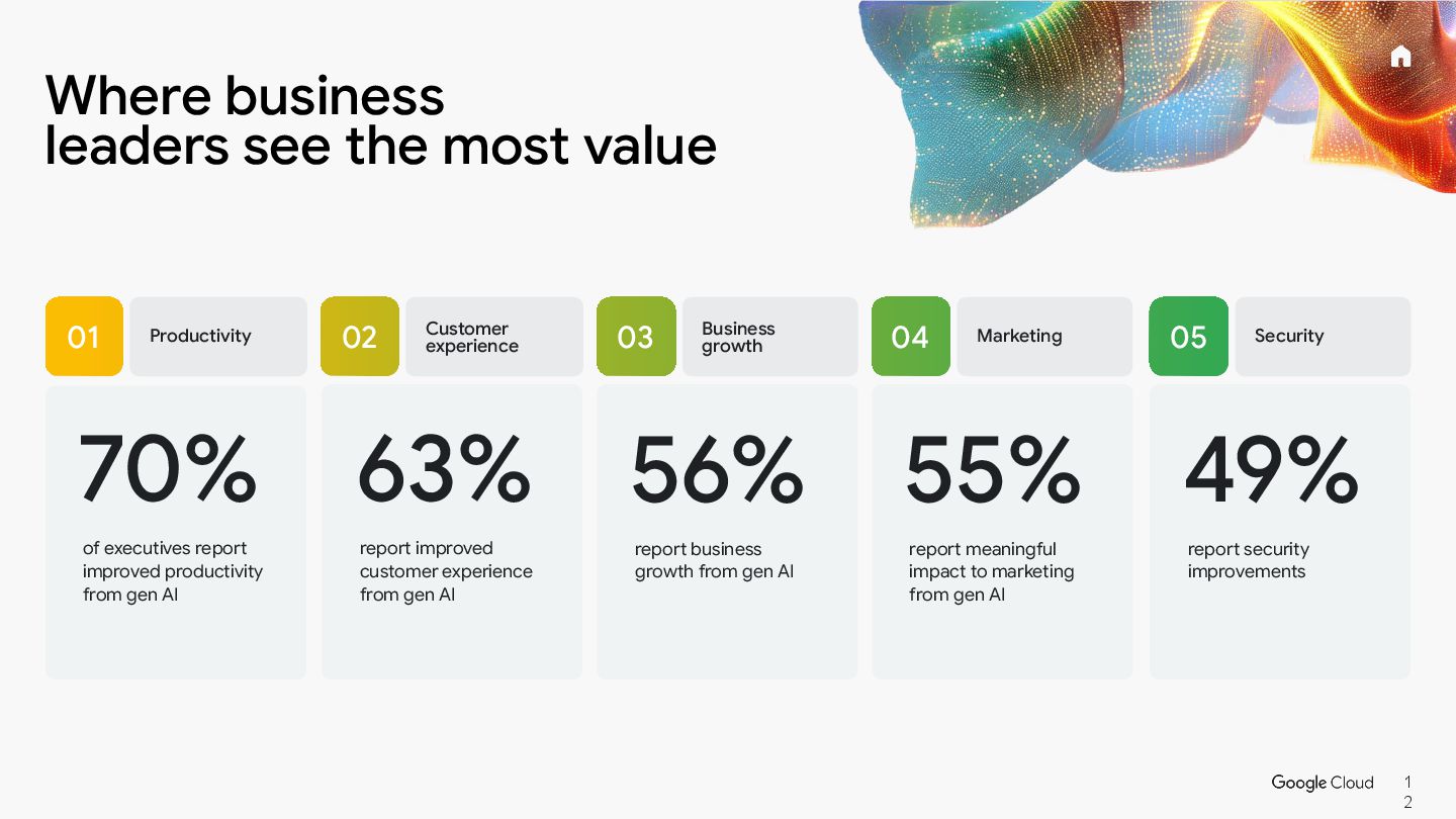 business growth from gen AI 55% report meaningful impact to marketing from gen AI 49% report security improvements Where business leaders see the most value 70% of executives report improved productivity from gen AI 01 02 03 04 05 Productivity Customer experience Business growth Marketing Security 1 2