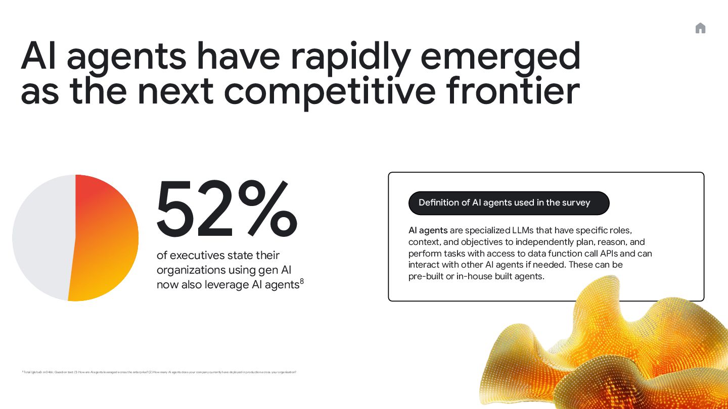 leverage AI agents8 52% 8 Total (global): n=3466; Question text: (1) How are AI agents leveraged across the enterprise? (2) How many AI agents does your company currently have deployed in production across your organization? AI agents are specialized LLMs that have specific roles, context, and objectives to independently plan, reason, and perform tasks with access to data function call APIs and can interact with other AI agents if needed. These can be pre-built or in-house built agents. Definition of AI agents used in the survey AI agents have rapidly emerged as the next competitive frontier