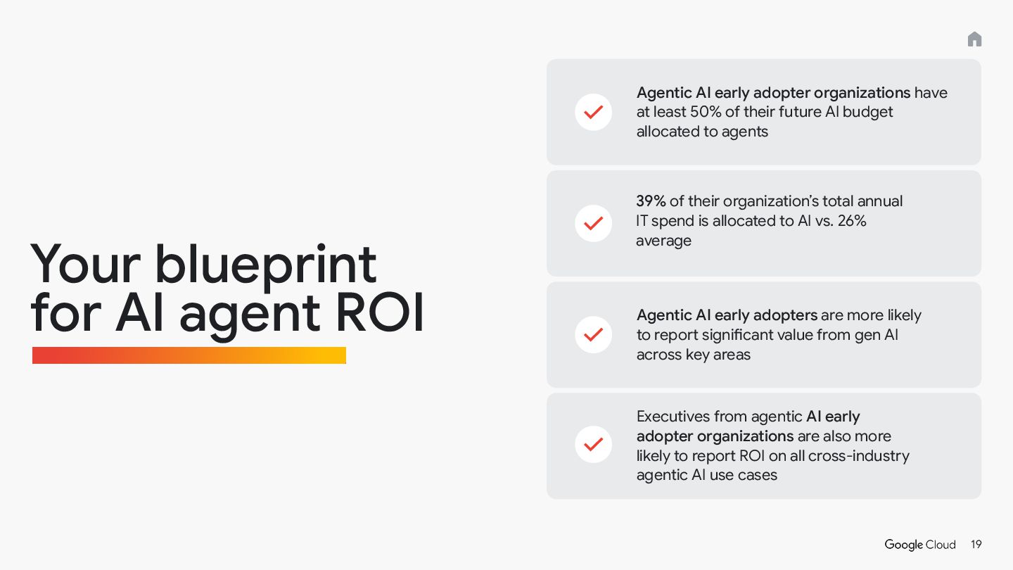 organizations have at least 50% of their future AI budget allocated to agents 39% of their organization’s total annual IT spend is allocated to AI vs. 26% average Agentic AI early adopters are more likely to report significant value from gen AI across key areas Executives from agentic AI early adopter organizations are also more likely to report ROI on all cross-industry agentic AI use cases 19