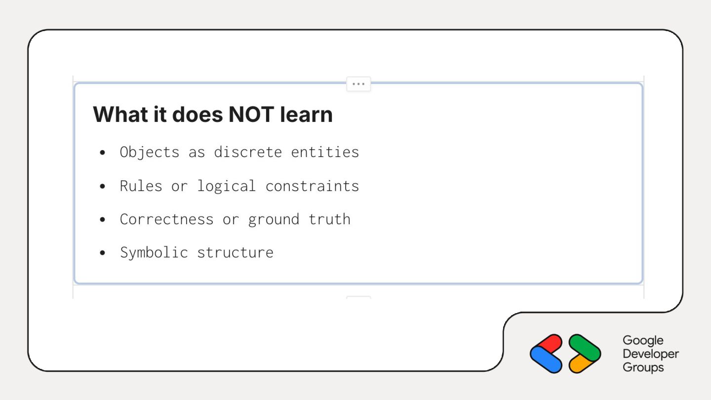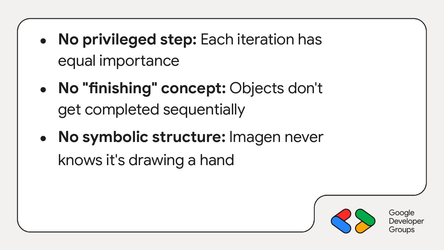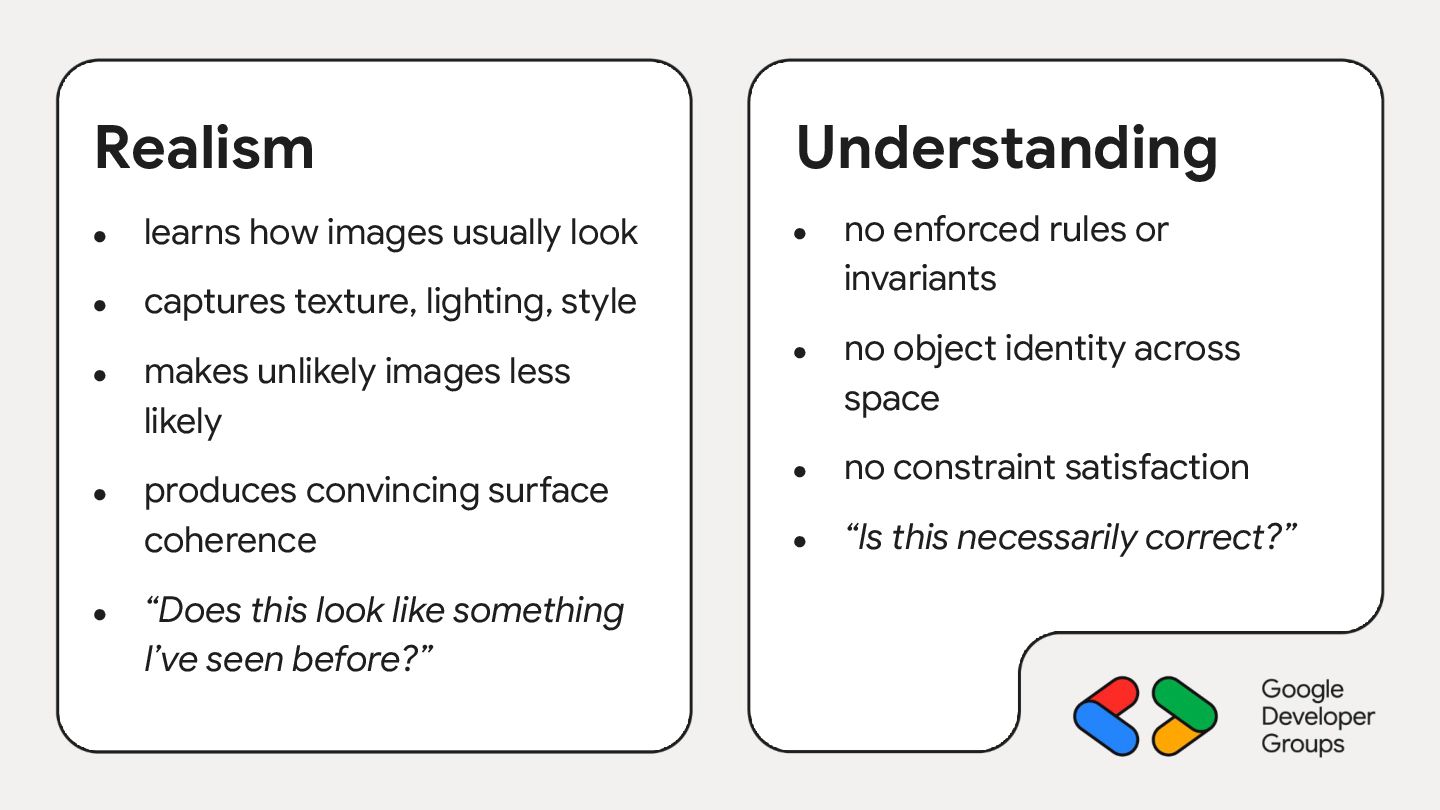 lighting, style • makes unlikely images less likely • produces convincing surface coherence • “Does this look like something I’ve seen before?” Understanding • no enforced rules or invariants • no object identity across space • no constraint satisfaction • “Is this necessarily correct?”